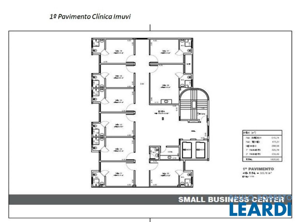a) Salas individuais tipo suíte, com wc privativo e área total de + ou – 25 M² localizadas no segundo andar, para consultórios e serviços de saúde.