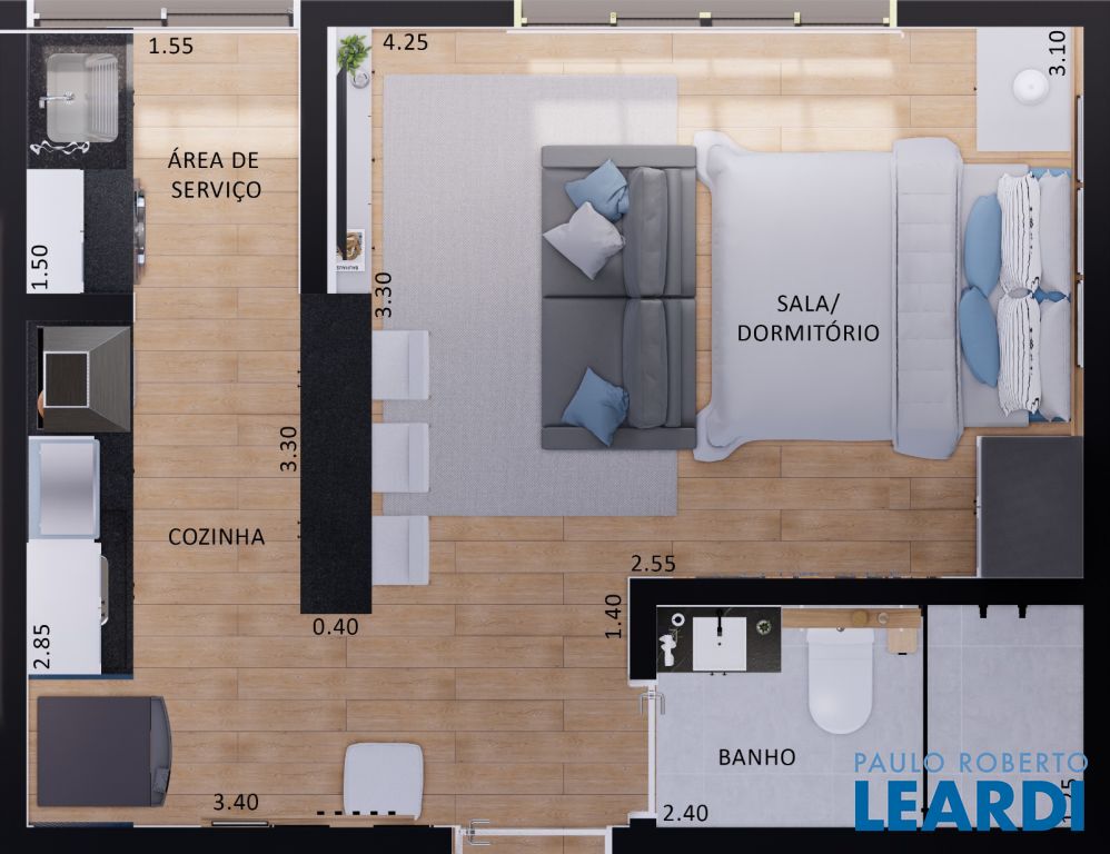 Área de 57 m², com quarto, sala, cozinha, banheiro e lavanderia!