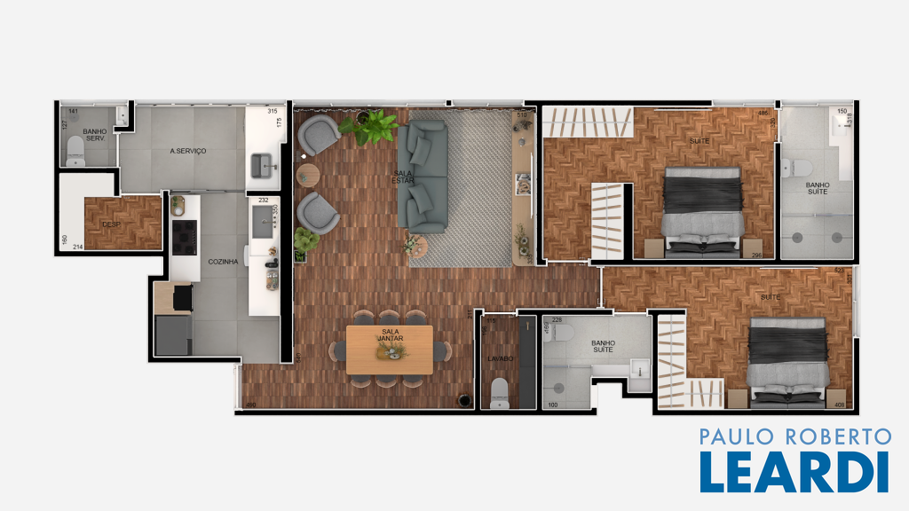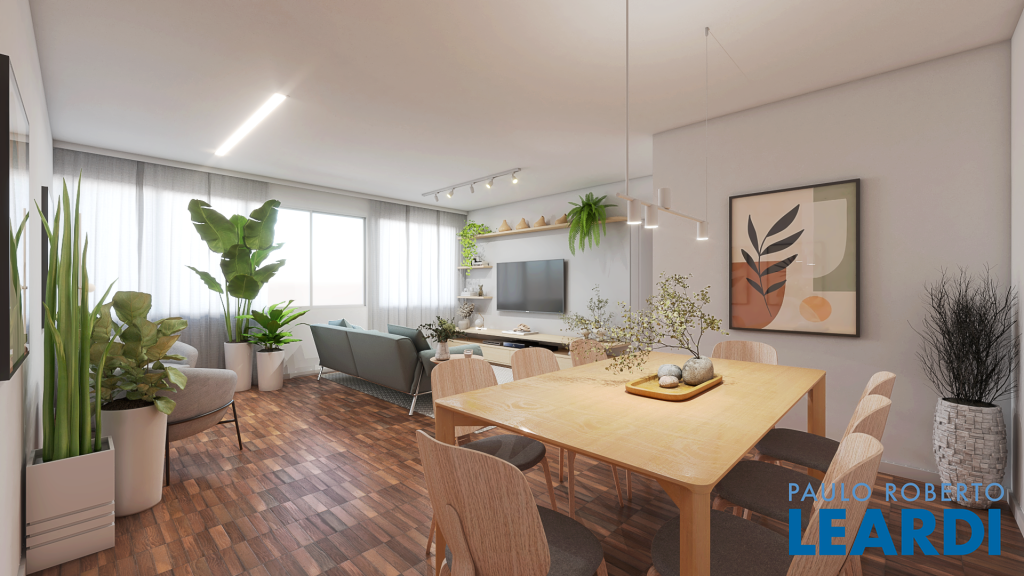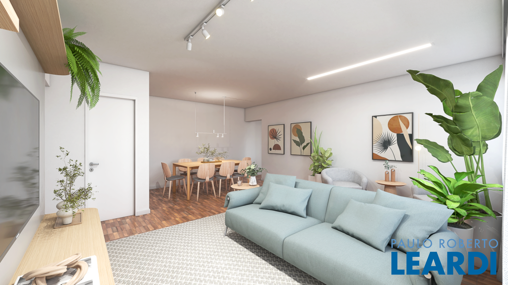 A planta original, que contava com três dormitórios, deu lugar a um novo layout com duas suítes sendo uma master com closet e uma sala estendida. De quebra, ainda foi possível incluir um lavabo, valorizando a área social.