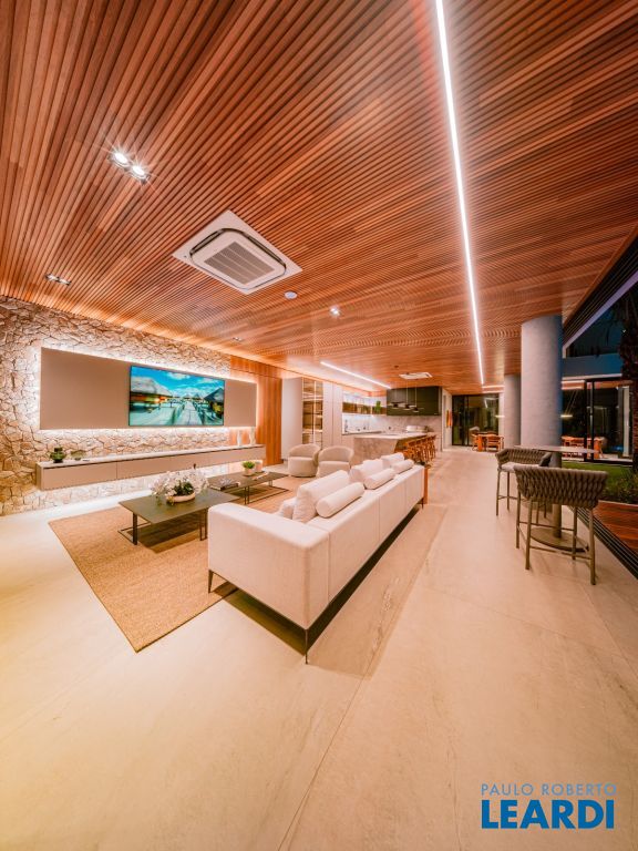Espaço Gourmet com Forro de madeira ripado em carvalho branco e Revestimento em Pedra Moledo