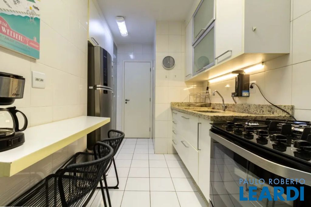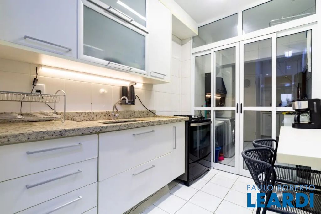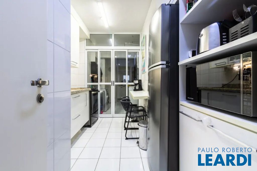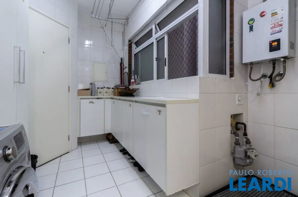 A cozinha tem armários embutidos e é integrada com a área de serviço, que por sinal é bem espaçosa e também tem armários embutidos, banheiro de empregada/serviço e uma despensa com prateleiras para sua maior organização.