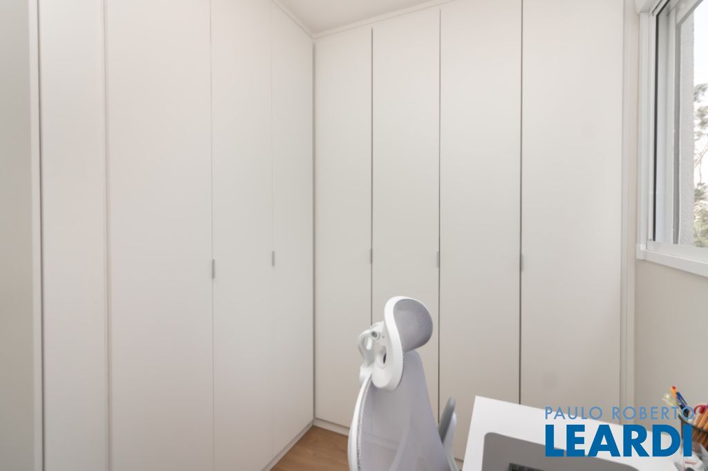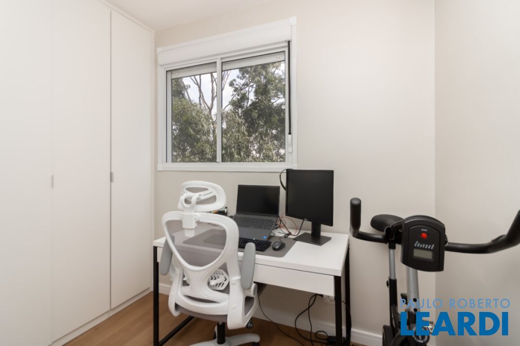 Quarto principal com janela blackout, ventilador de teto e cabeceira fixa. Segundo quarto adaptado para closet/escritório, com armários planejados (podendo ser revertido em dormitório).