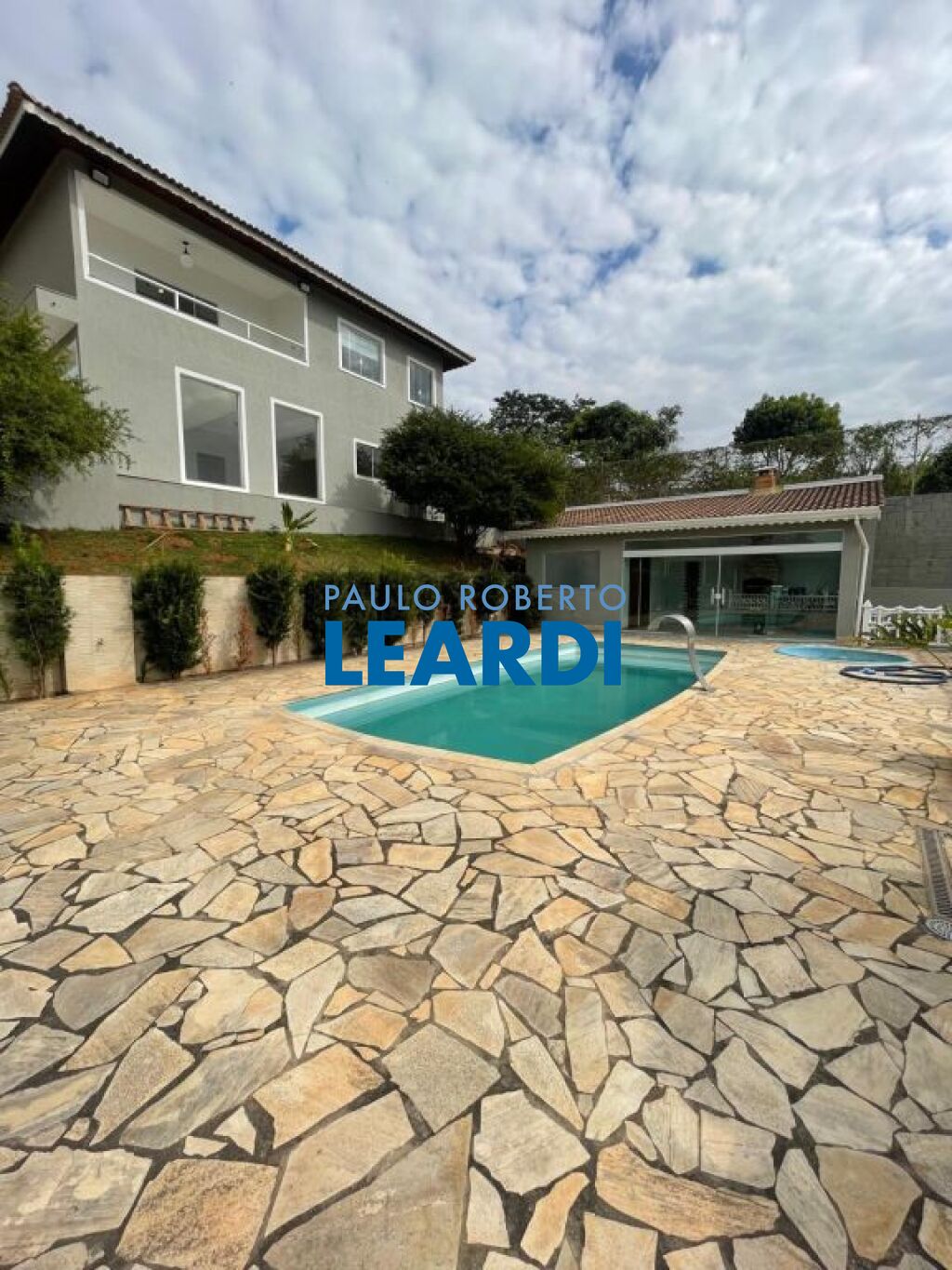 Salão da piscina com outra churrasqueira, quarto de depósito e wc;