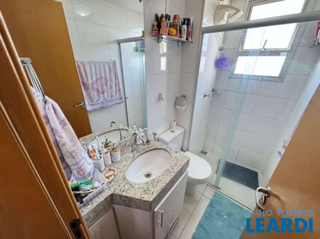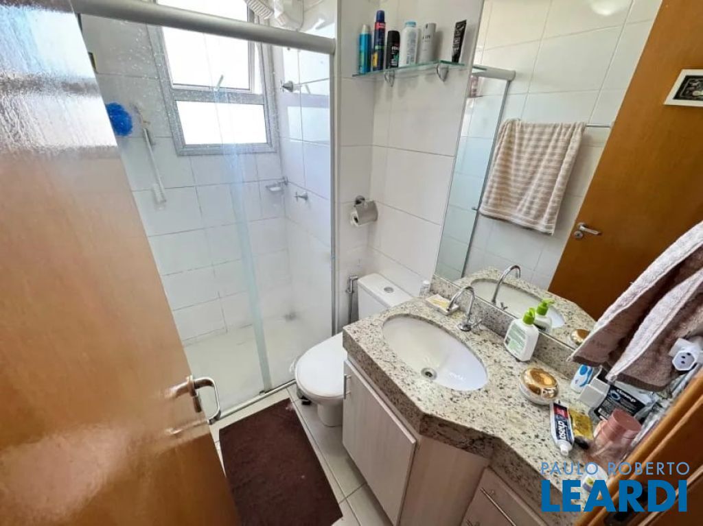 Banheiros com bancada em granito, armário, espelho e box em blindex.