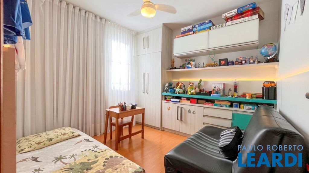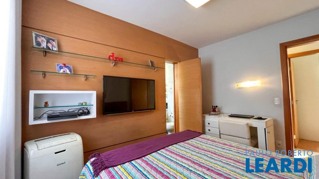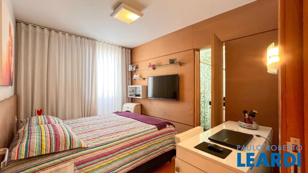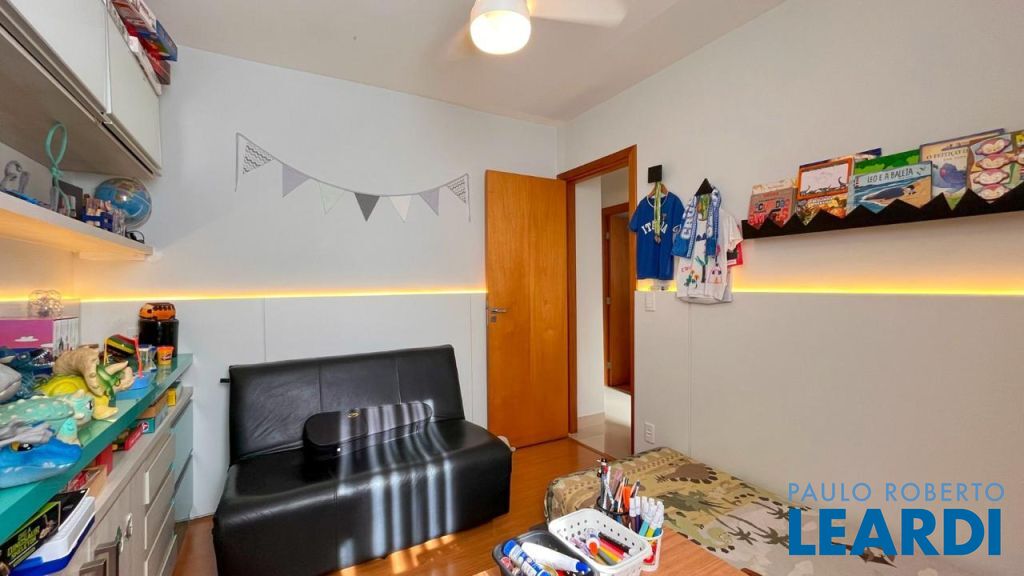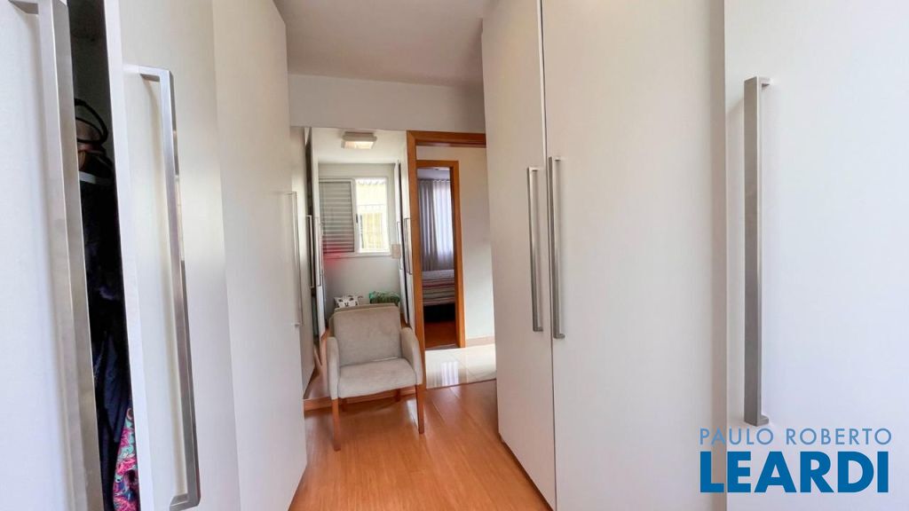 3 quartos com armários planejados, sendo 1 suíte, pisos laminados e luminárias.