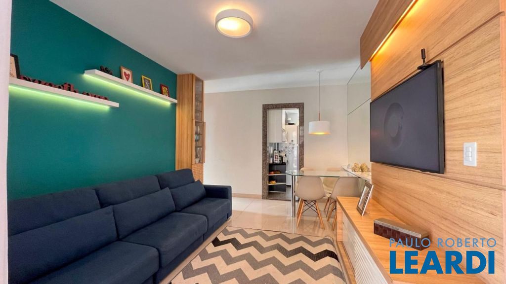 Sala para 2 ambientes com projeto de iluminação em LED, painel de TV e piso porcelanato.