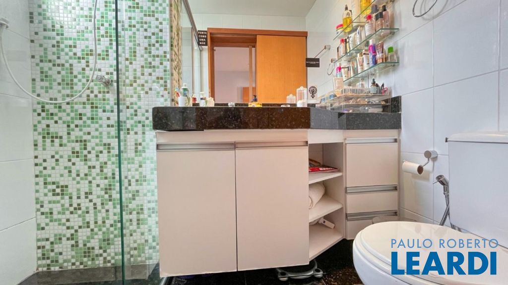 Banheiros com armários, box e espelhos.