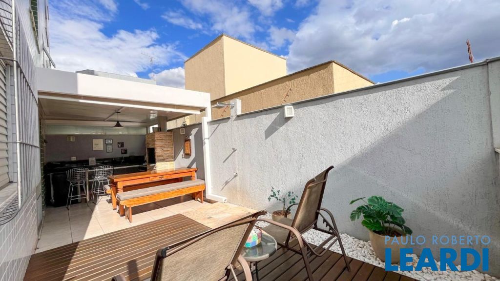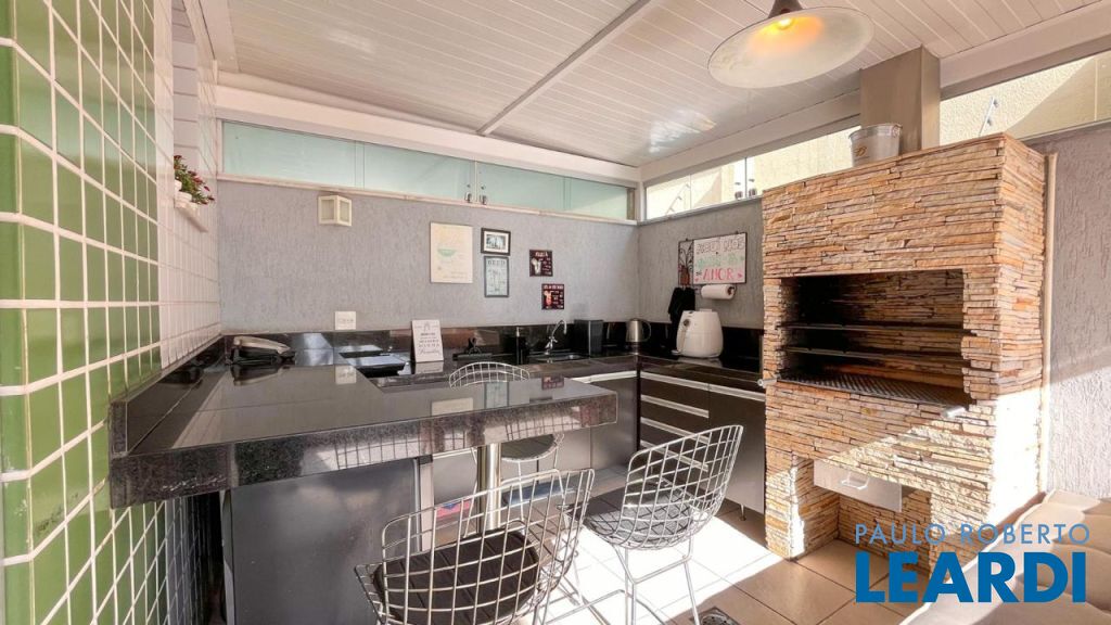 Área externa diferenciada com deck em madeira, espaço gourmet com churrasqueira em pedra São Tomé, bancadas em granito e armários.