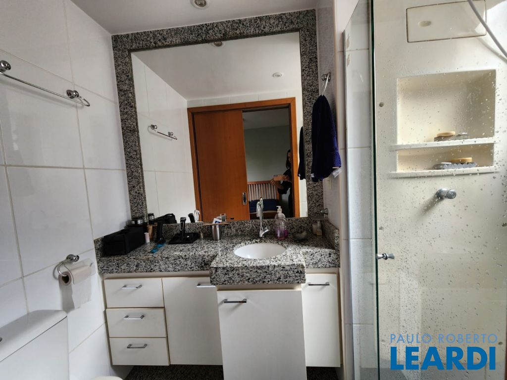 Banho social e suíte com box, espelhos e armários;