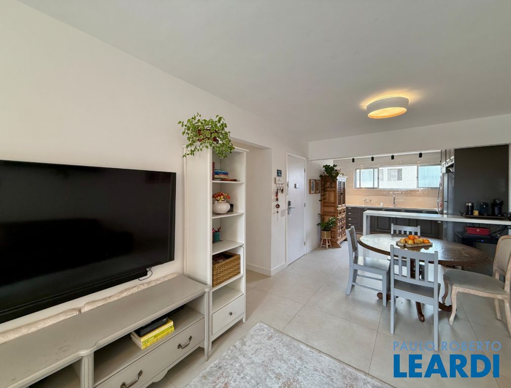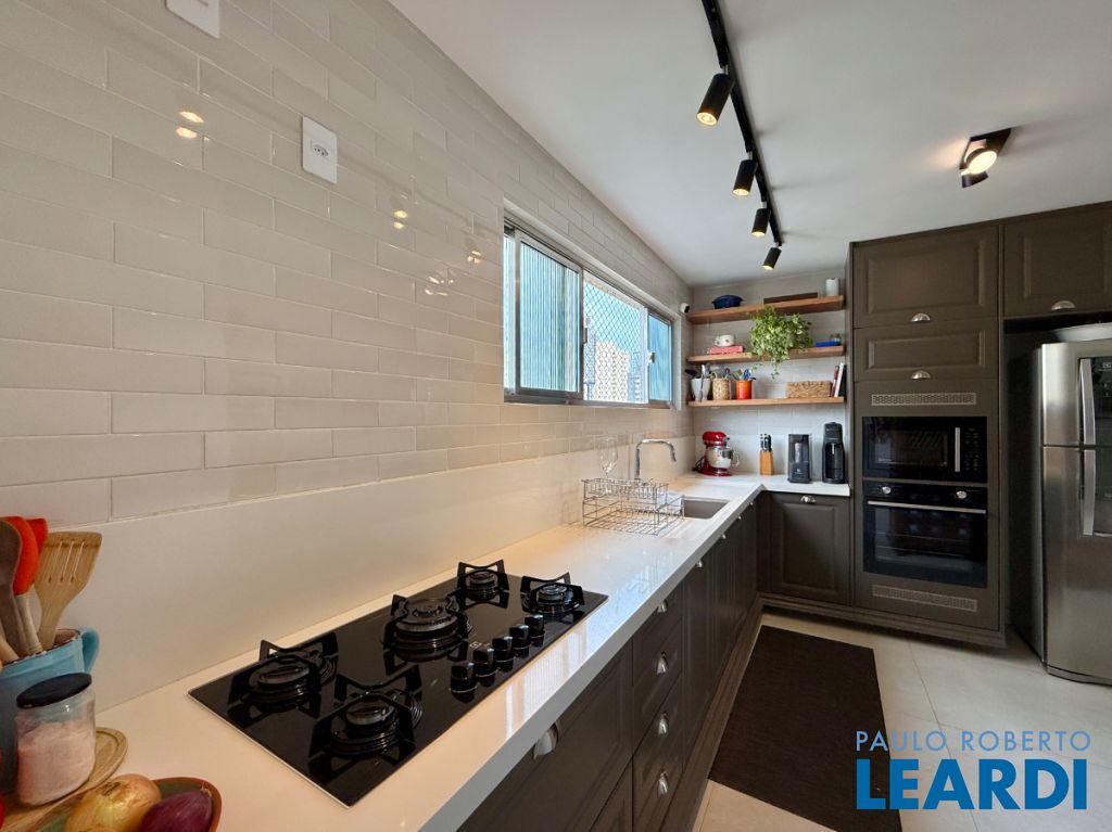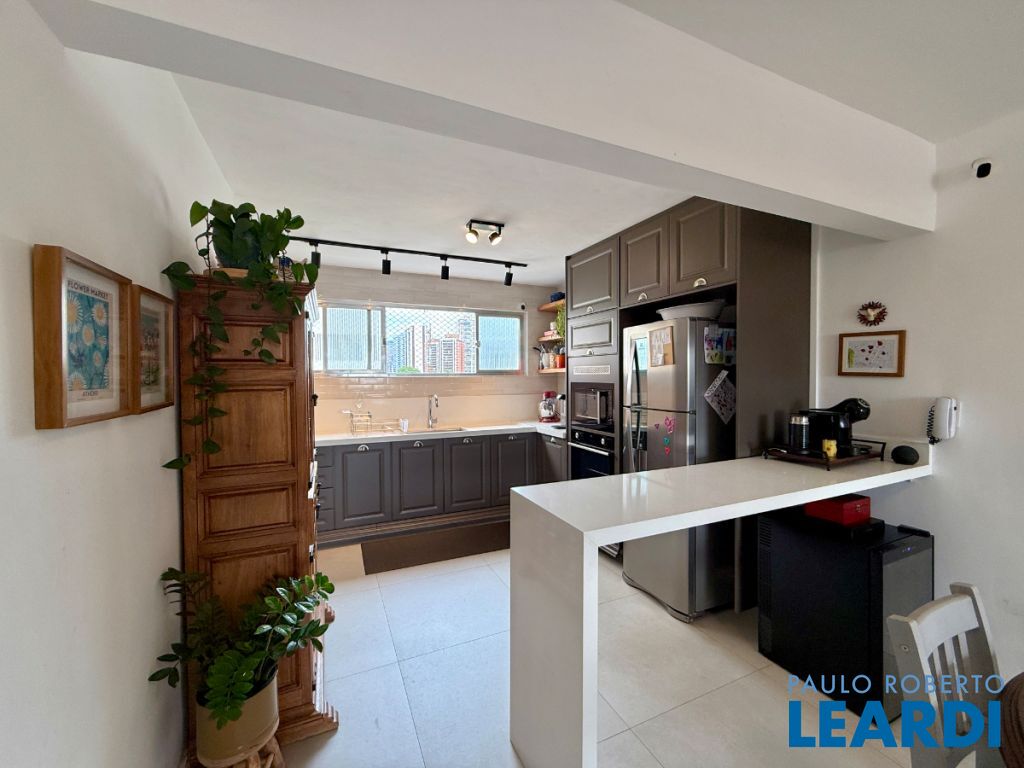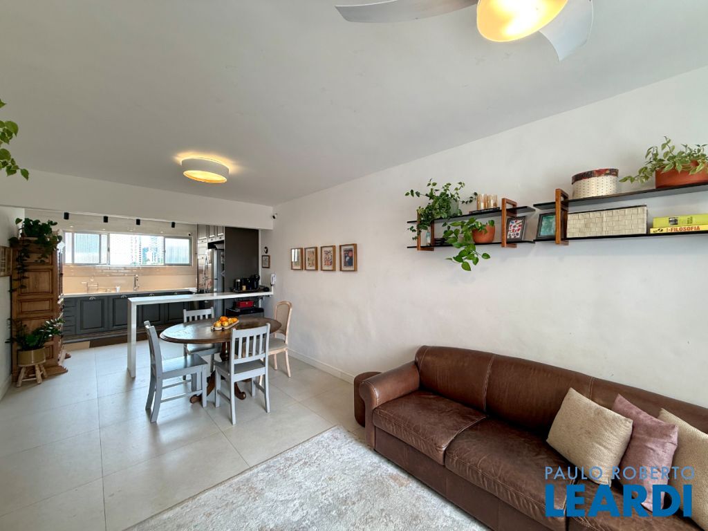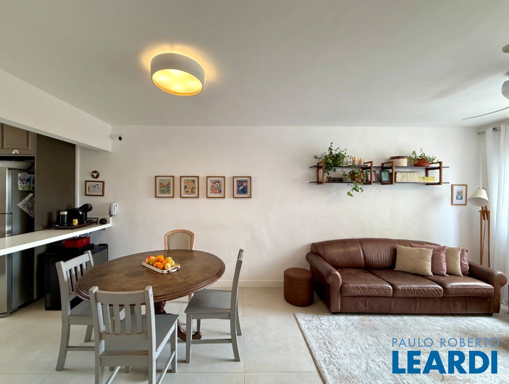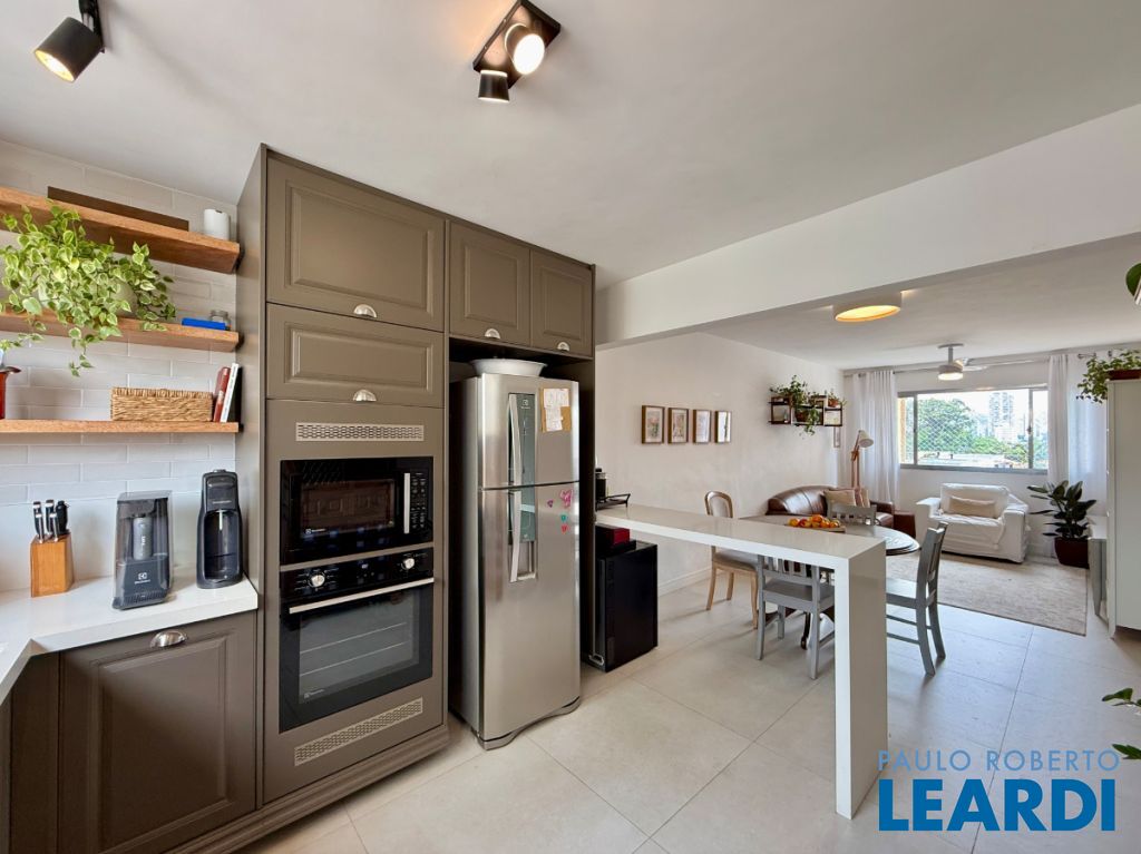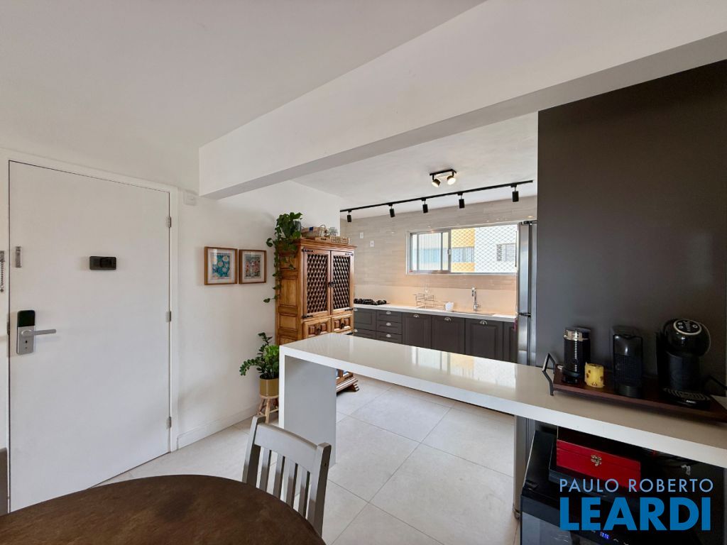 O apartamento conta com uma cozinha integrada, área de serviço e um banheiro de serviço, além de móveis planejados que otimizam o espaço. O piso em porcelanato traz modernidade e facilita a manutenção.