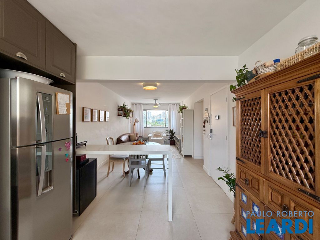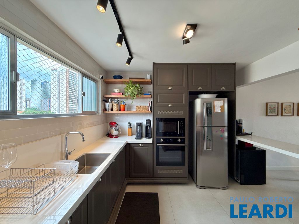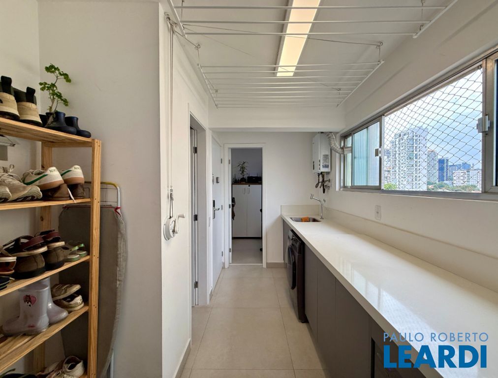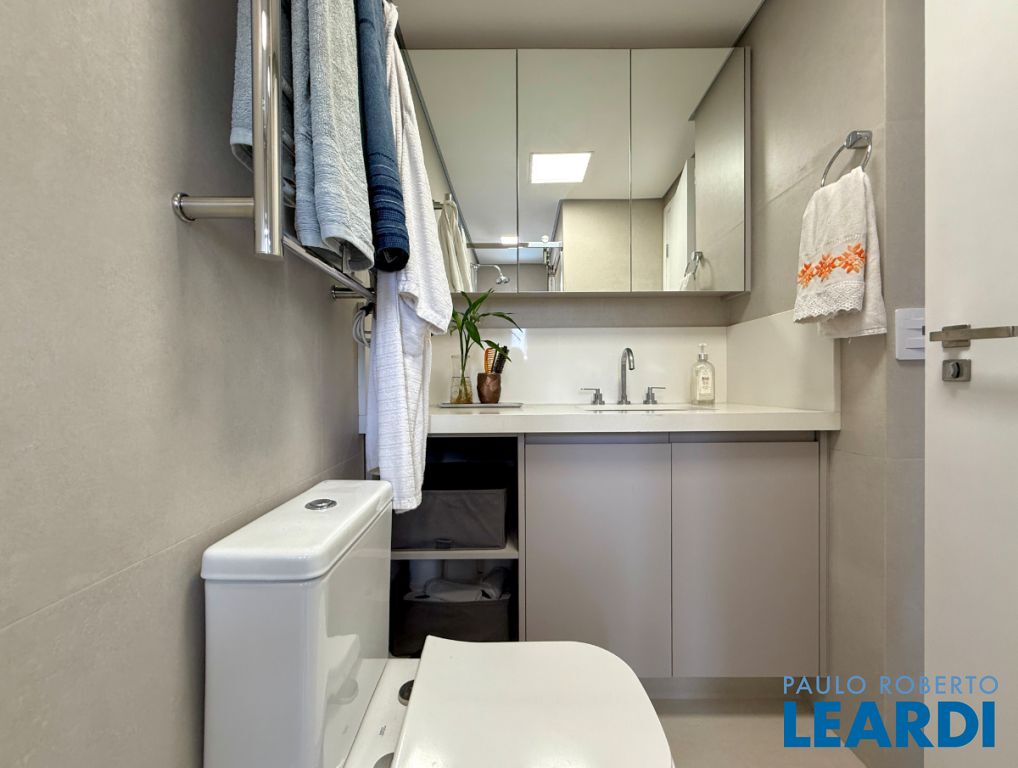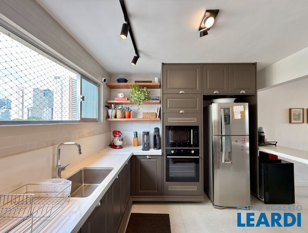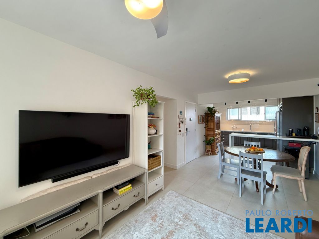 O apartamento conta com uma cozinha integrada, área de serviço e um banheiro de serviço, além de móveis planejados que otimizam o espaço. O piso em porcelanato traz modernidade e facilita a manutenção.