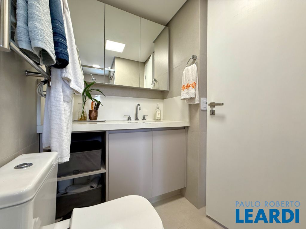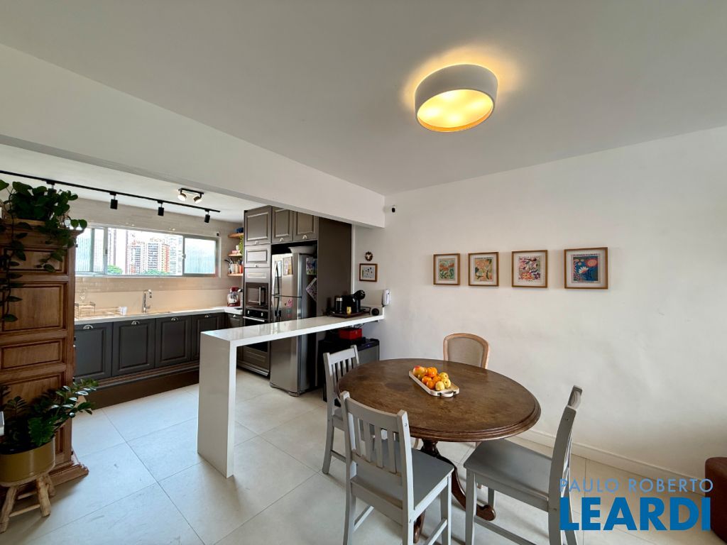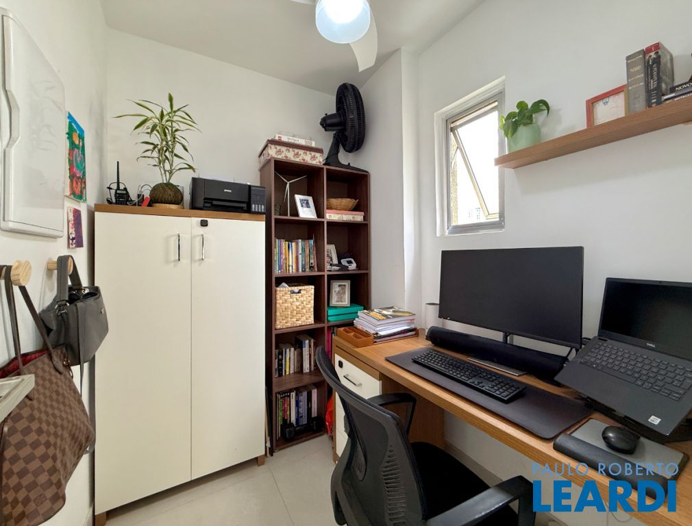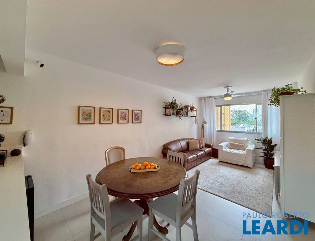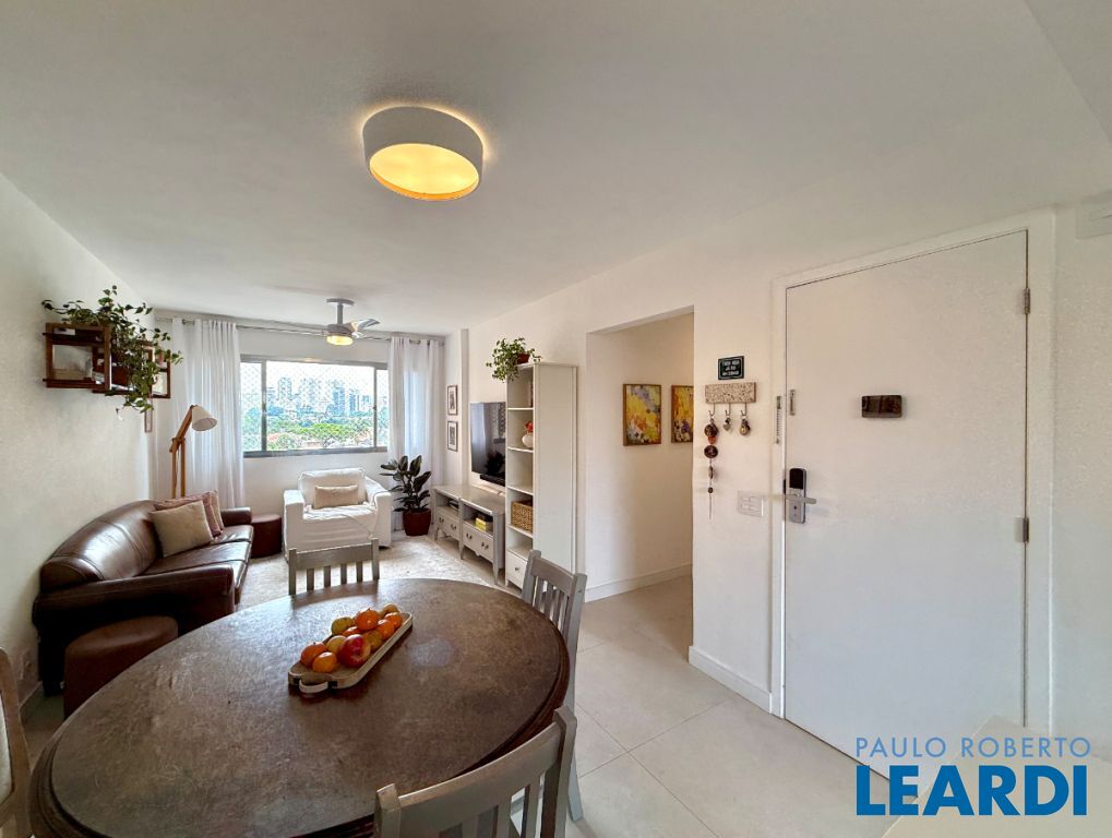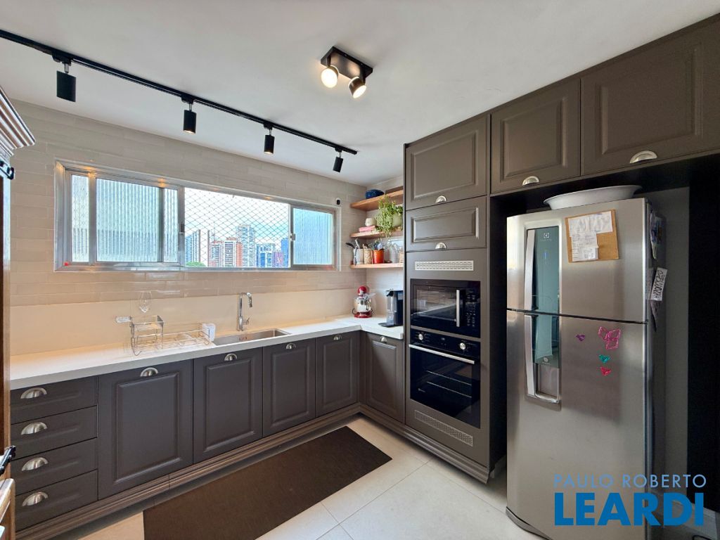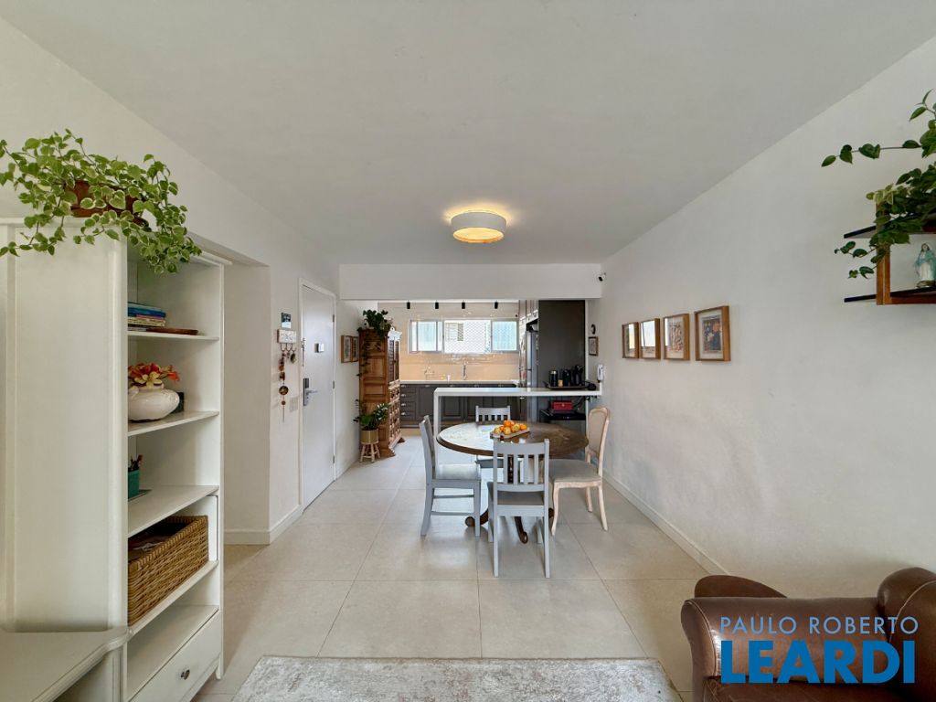 O apartamento conta com uma cozinha integrada, área de serviço e um banheiro de serviço, além de móveis planejados que otimizam o espaço. O piso em porcelanato traz modernidade e facilita a manutenção.