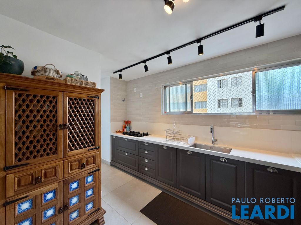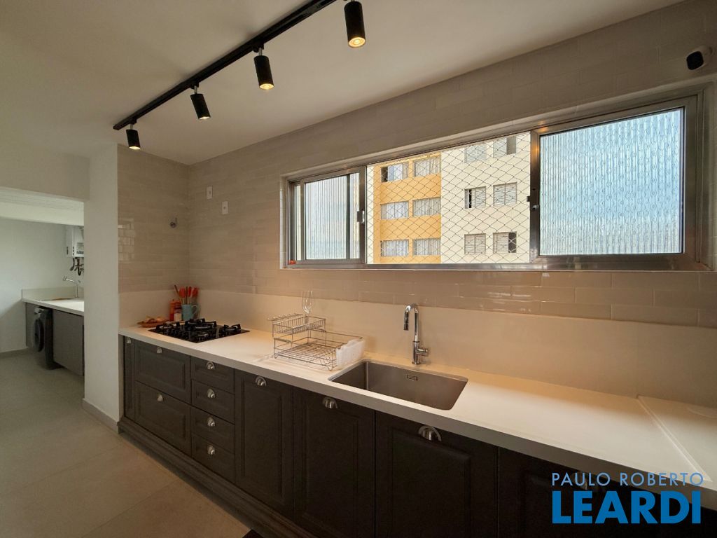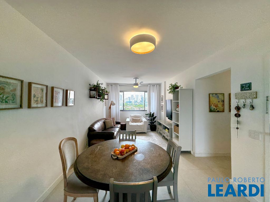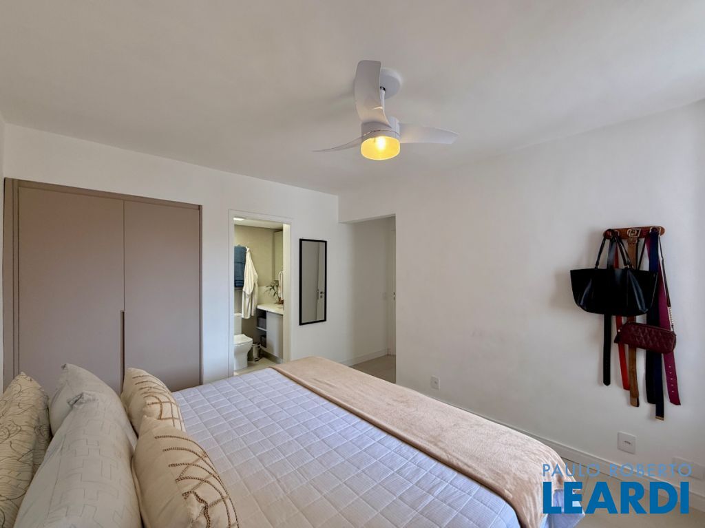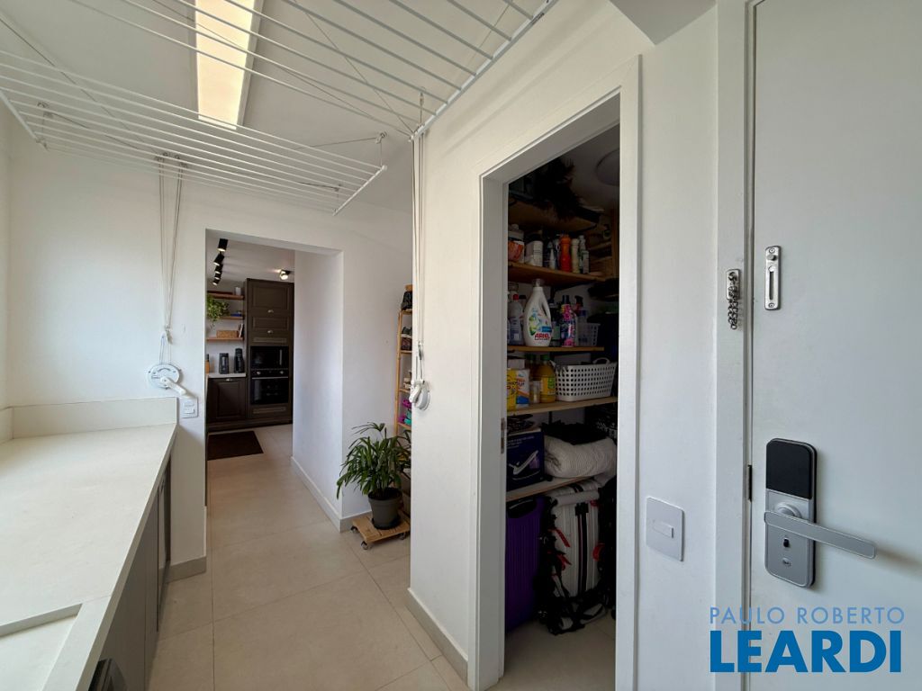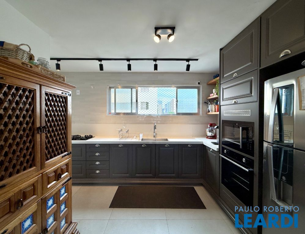 O apartamento conta com uma cozinha integrada, área de serviço e um banheiro de serviço, além de móveis planejados que otimizam o espaço. O piso em porcelanato traz modernidade e facilita a manutenção.