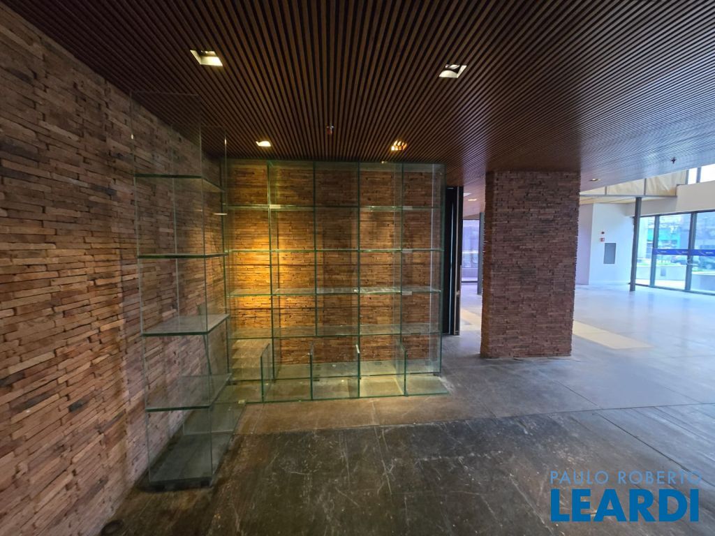 Espaço com prateleiras de vidro, ideal para exposições ou vitrines;