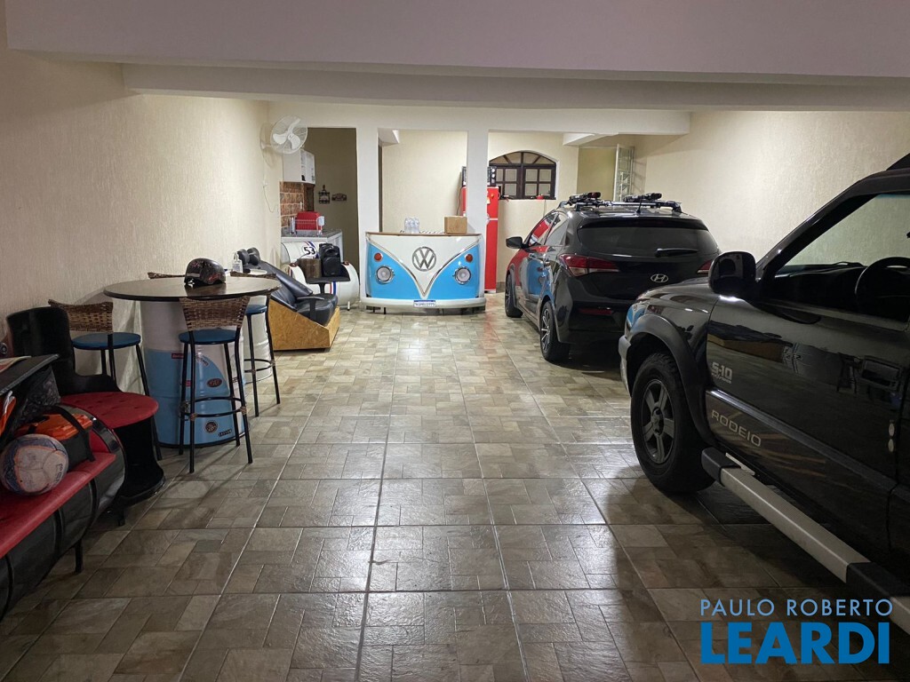 Garagem com vaga para 3 carros, com churrasqueira, banheiro e uma despensa.