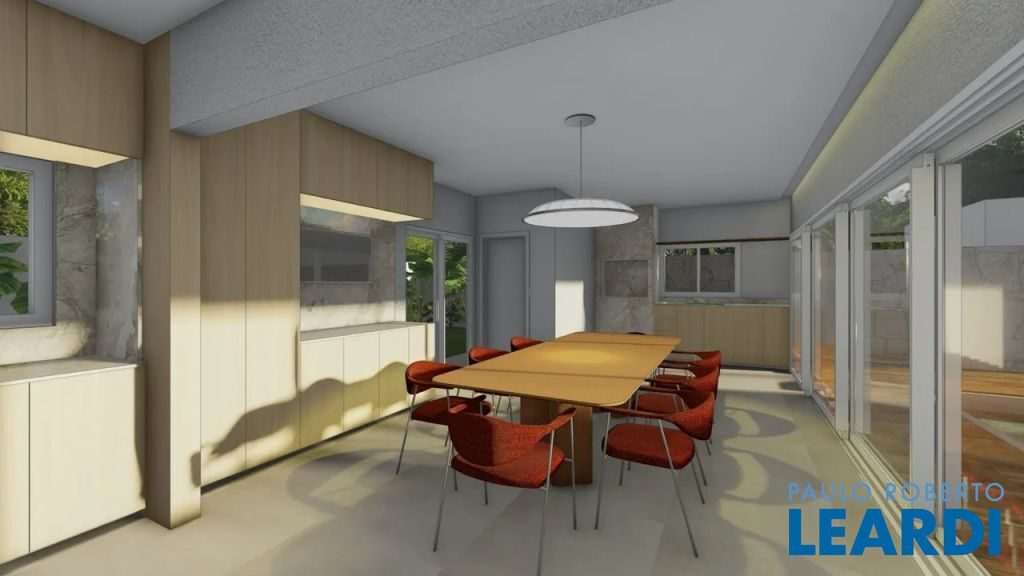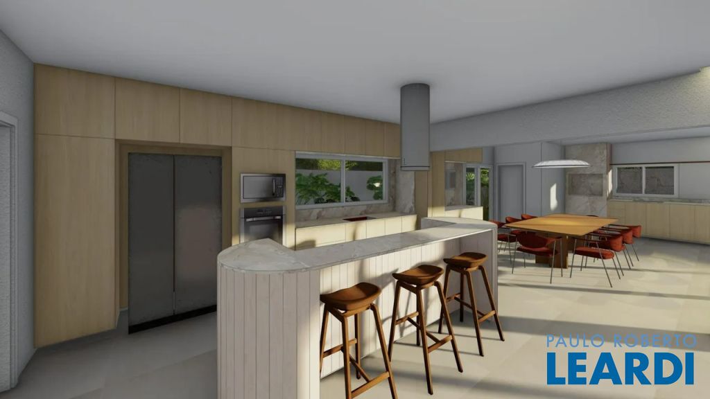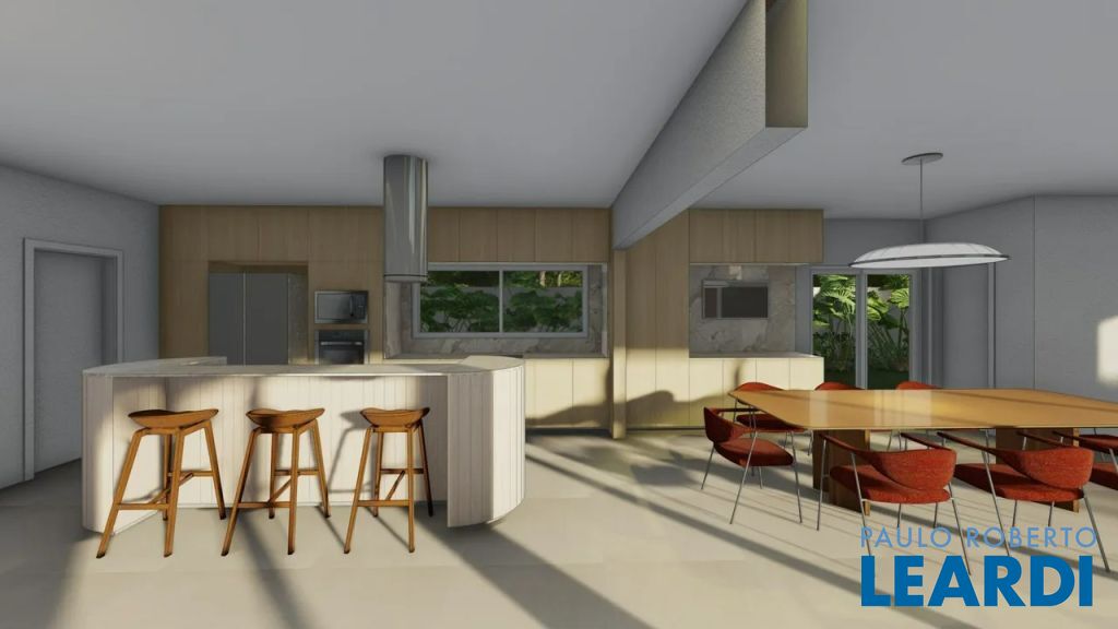 No térreo há um hall com pé direito duplo na entrada, escritório, uma suíte, lavabo, despensa, lavanderia, deposito externo, sala de TV com lareira ecológica a gás integrada com sala de jantar, cozinha com ilha, área gourmet com banheiro completo.