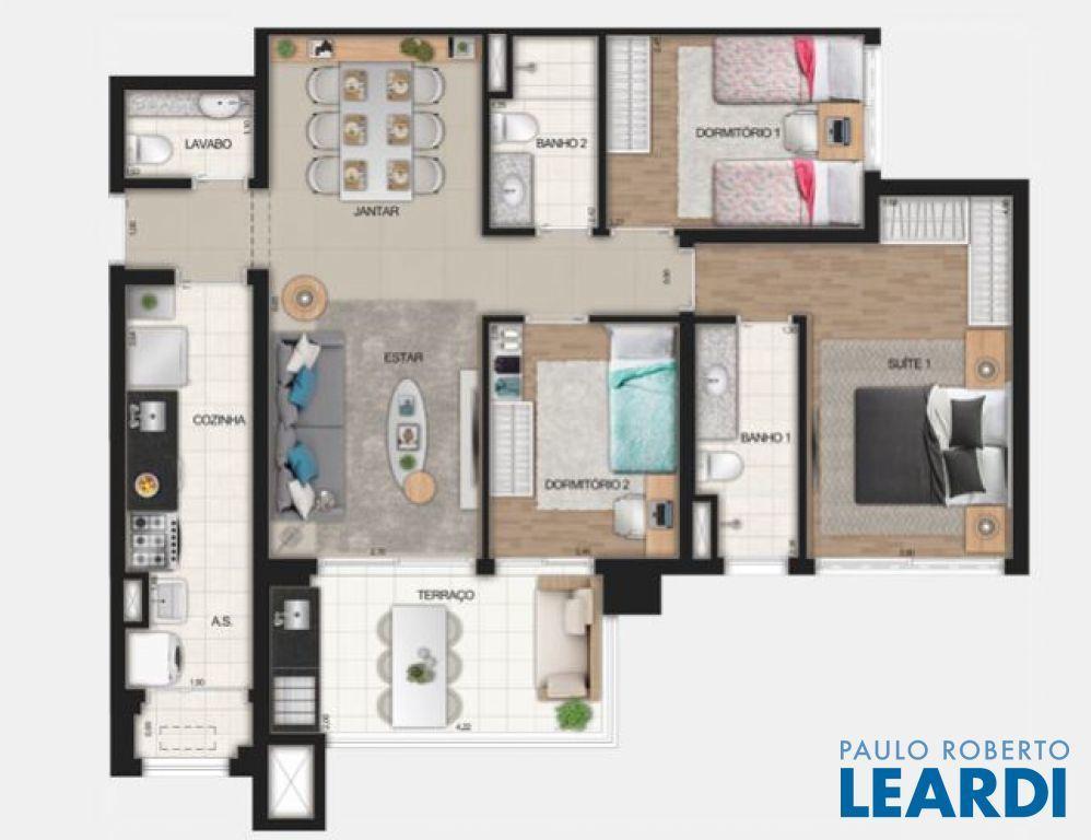 Apartamento com 3 Dormitórios, 1 suítes, sala para 2 ambientes com terraço, 1 banheiro, 1 lavabo, cozinha, lavanderia e 2 vagas de garagem.