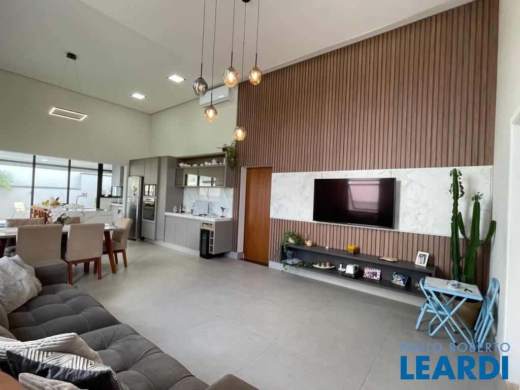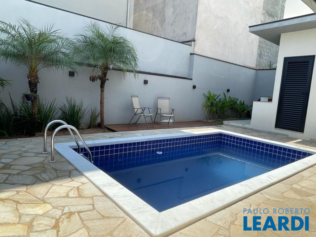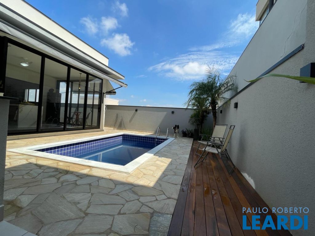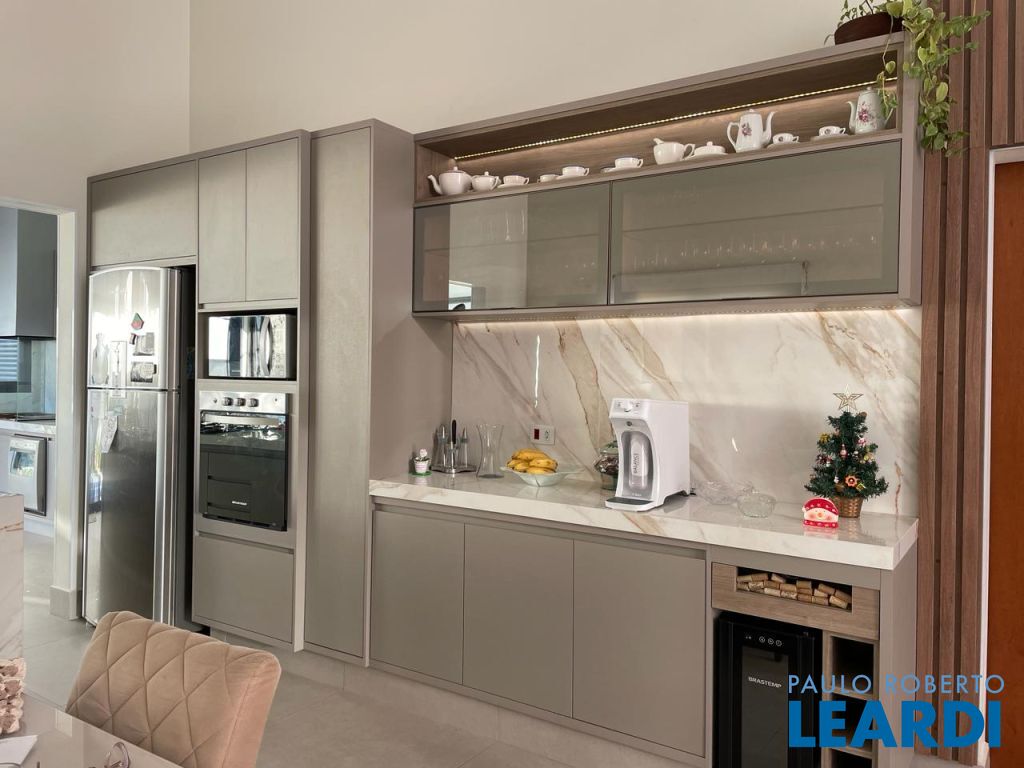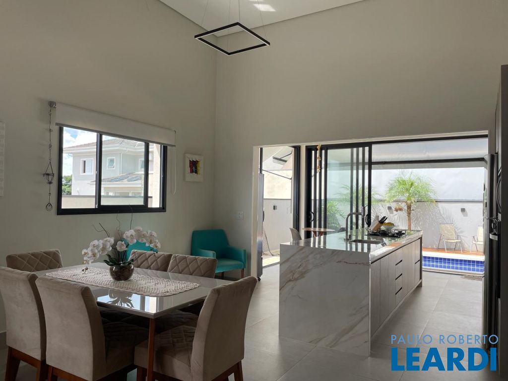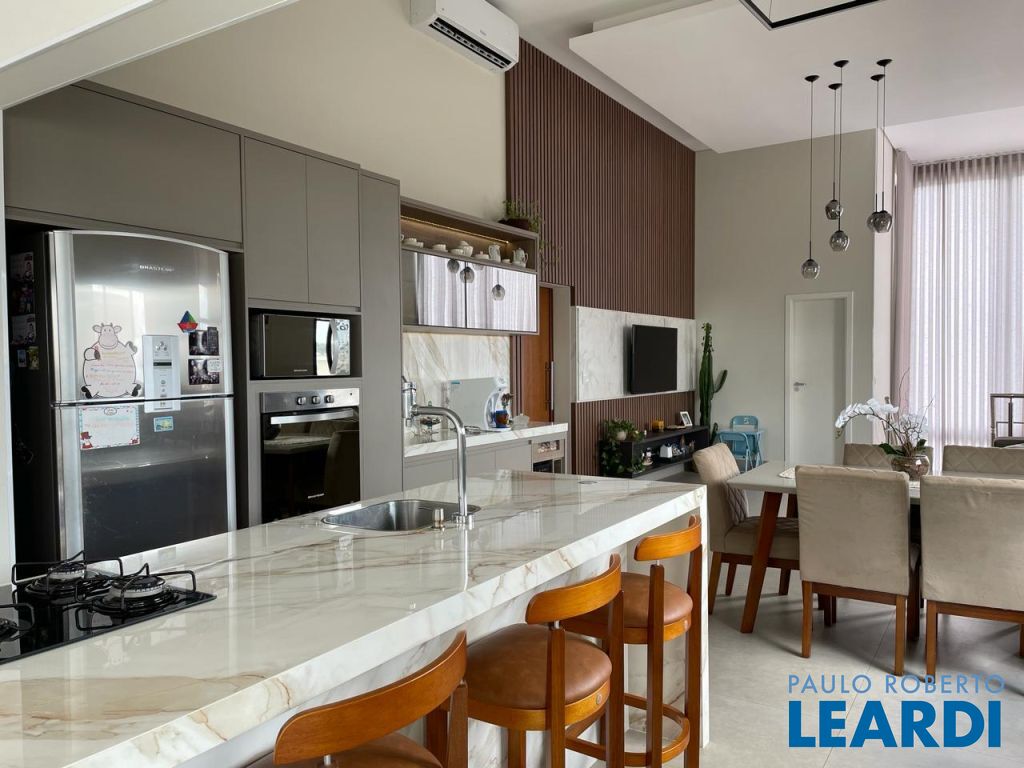 São 3 suítes com closet e ar condicionado, todas no mesmo nível dos demais ambientes. LIving com pé direito duplo, integrando o exclusivo painel de TV, jantar, cozinha e área gournet. Conta ainda com um lindo lavabo. A cozinha é um sonho, com ilha e bancadas em mármore branco paraná, elegantemente decorada e equipada com planejados. Despensa e lavanderia completam este ambiente . Todo o espaço bem iluminado e com acesso à piscina que ainda conta com banheiro e depósito. Garagem coberta para dois veículos.