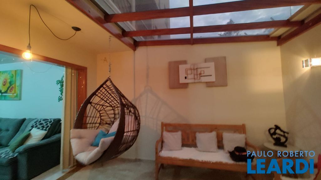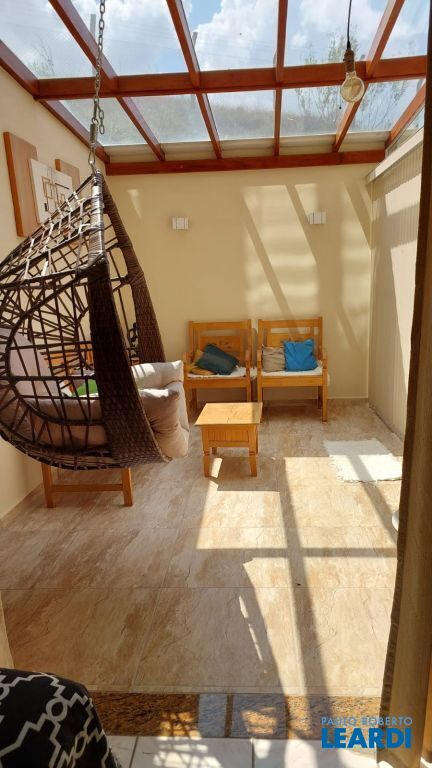 Charmosa sala de estar integrada, coberta com pergolado e fechamento em vidros, com cadeira suspensa tipo gota, criando um ambiente perfeito para descanso