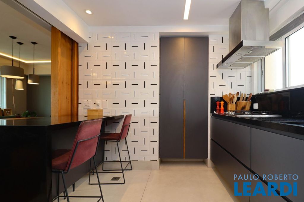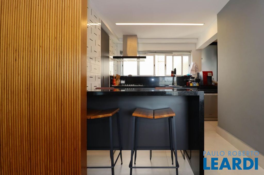 Cozinha americana, com possibilidade de fechamento por um elegante painel de madeira ripado.
