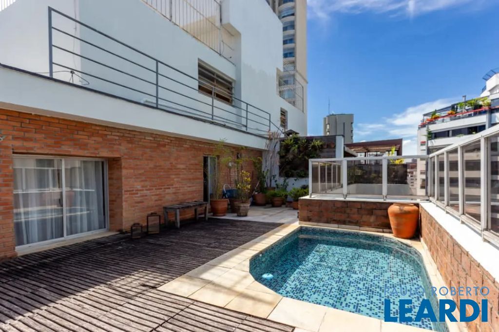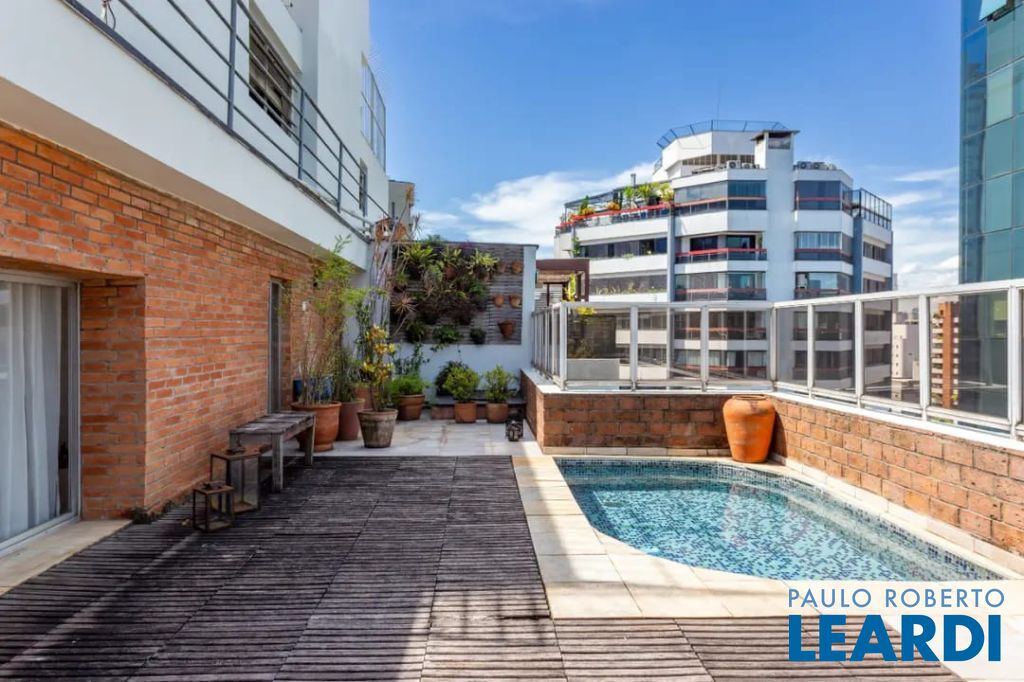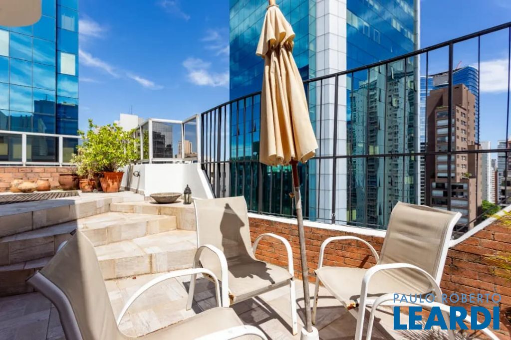Cobertura dupléx localizada em rua nobre do Itaim Bibi, a apenas um quarteirão da Faria Lima. Se você trabalha na região, imagina almoçar em casa, curtir seu super terraço e ainda dar um mergulho relaxante na piscina. A cobertura se distribui em dois níveis bem definidos. No primeiro andar, sala com varandinha, cozinha tradicional( que facilmente poderá ser integrada a sala), área de serviço e dependência completa de funcionária. Nesse piso também ficam os 3 dormitórios, sendo 1 suíte. No segundo piso, uma aconchegante sala com lareira e um espaçoso terraço com piscina. A área externa é uma delícia, possuí um deck de madeira, perfeito para banhos de sol, leituras tranquilas, cheio de plantas e uma belíssima vista urbana. Perfeita para reunir amigos. Existia um banheiro que dava suporte a piscina, mas foi transformado em mini biblioteca, que pode ser revertido a qualquer momento. Portaria 24 horas, duas vagas excelentes. Localização que dispensa elogios, conforto e elegância para sua vida! Agende uma visita e conheça seu novo lar!!2003