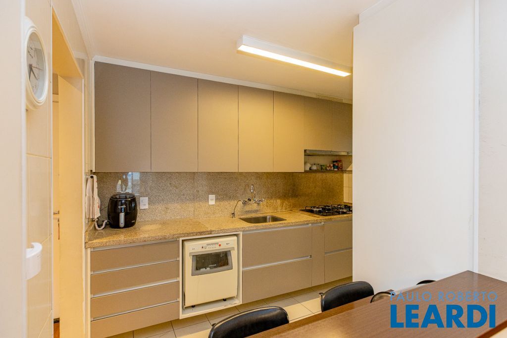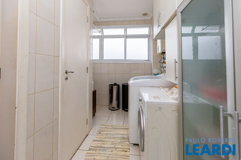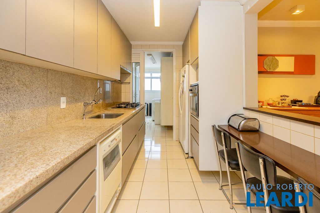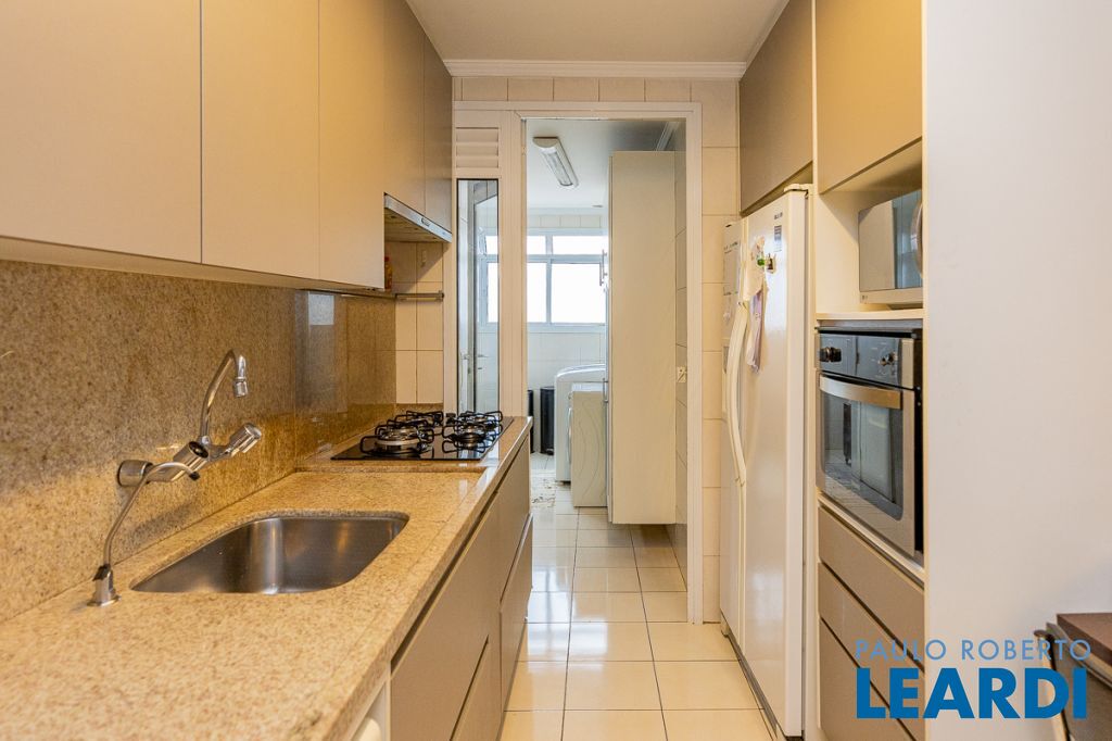 A cozinha americana, repleta de armários, conecta-se à lavanderia espaçosa, que também possui armários e ainda dispõe de quarto e banheiro de empregada, garantindo praticidade no dia a dia. O apartamento é voltado para a frente, proporcionando vista ampla, iluminação natural abundante e uma atmosfera acolhedora.