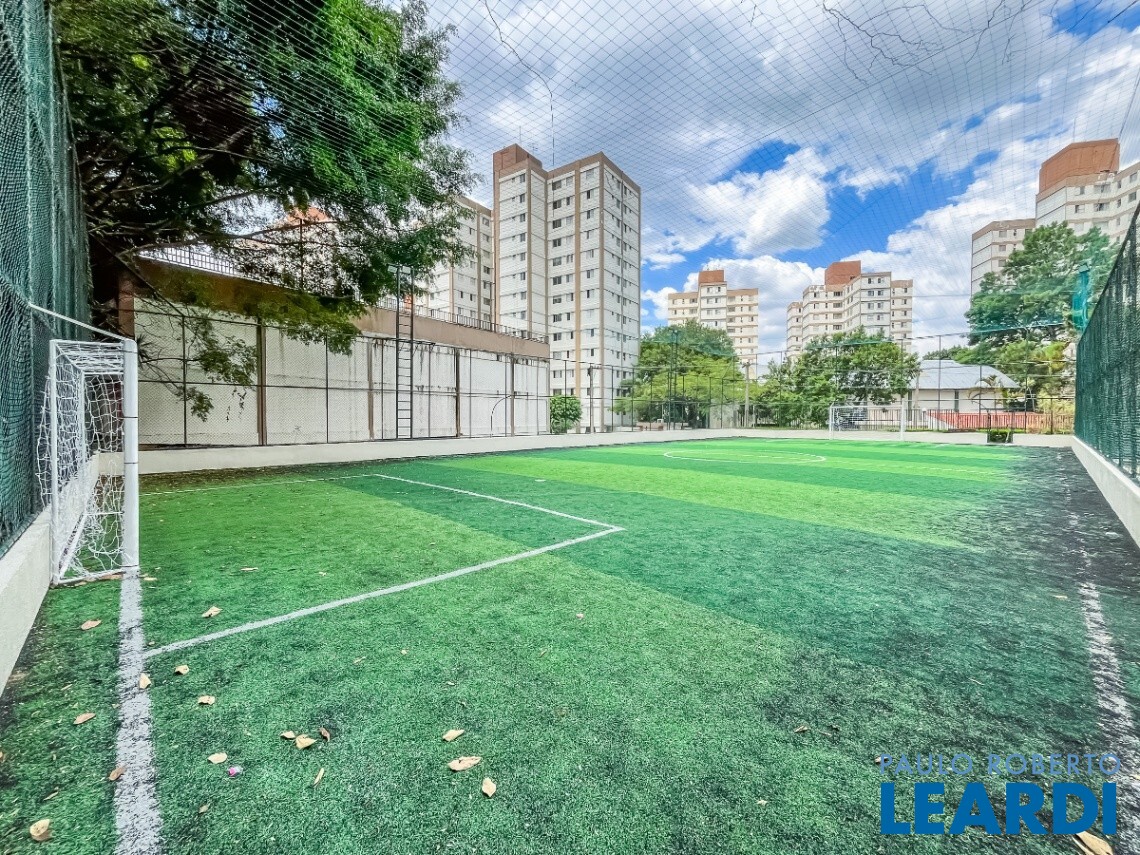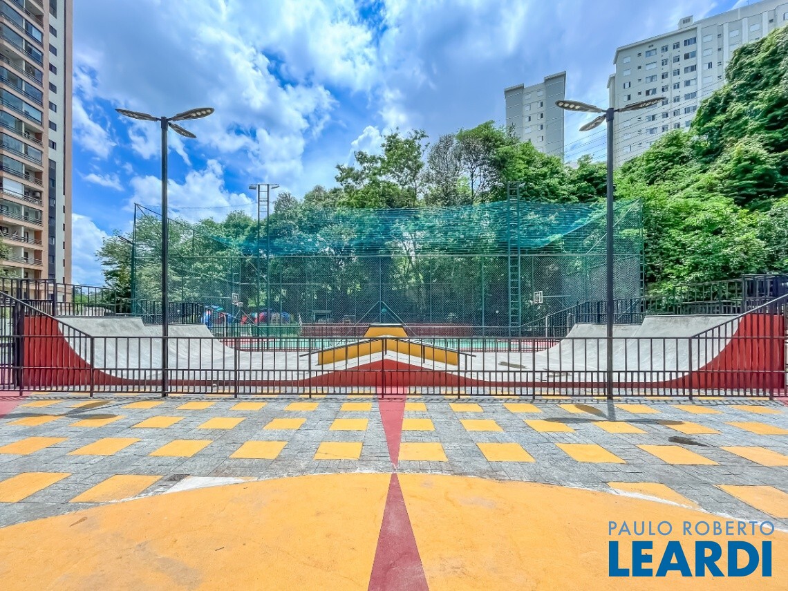 Quadra poliesportiva e campo de futebol com grama sintética, rampas de skate, playground, pistas de caminhada e espaços de convivência arborizados.