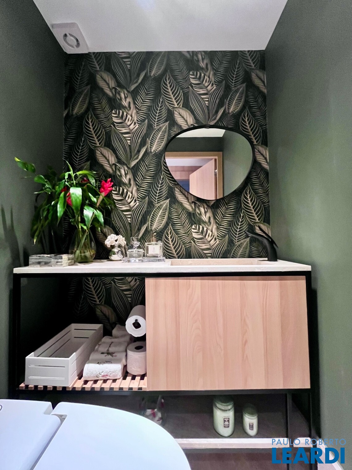 Lavabo com papel de parede italiano e tampo em travertino