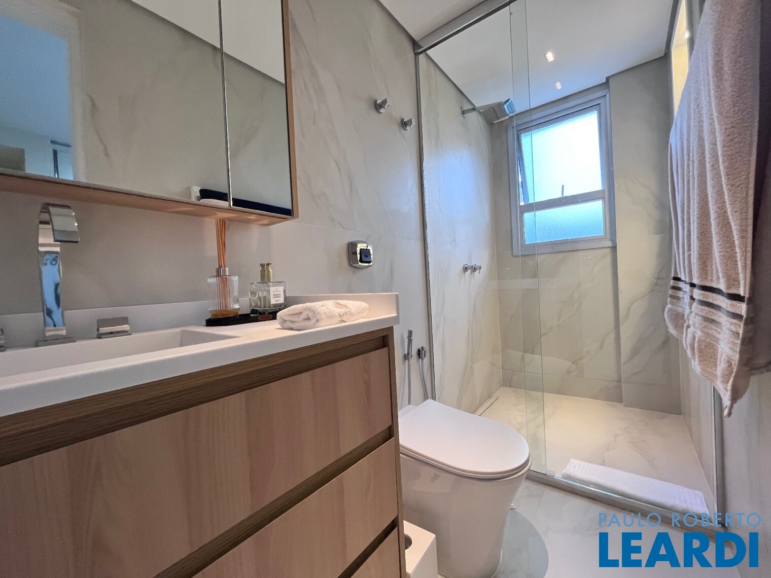Banheiros com box até o teto e acabamentos em Corian