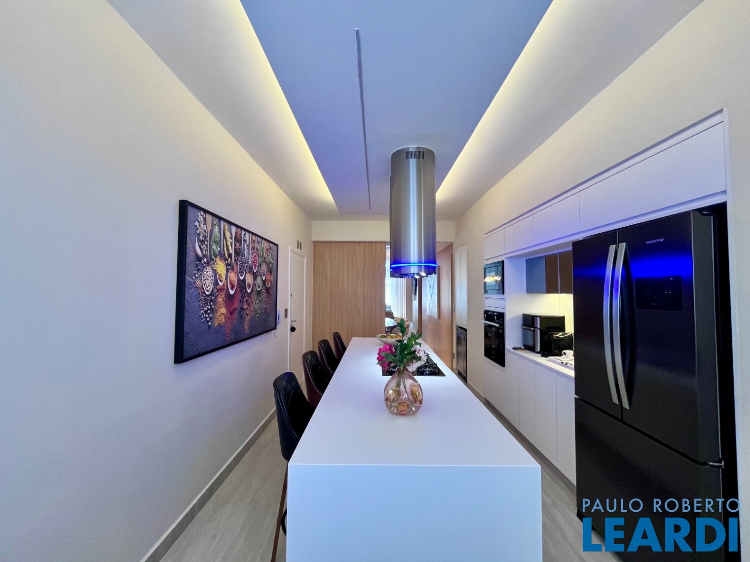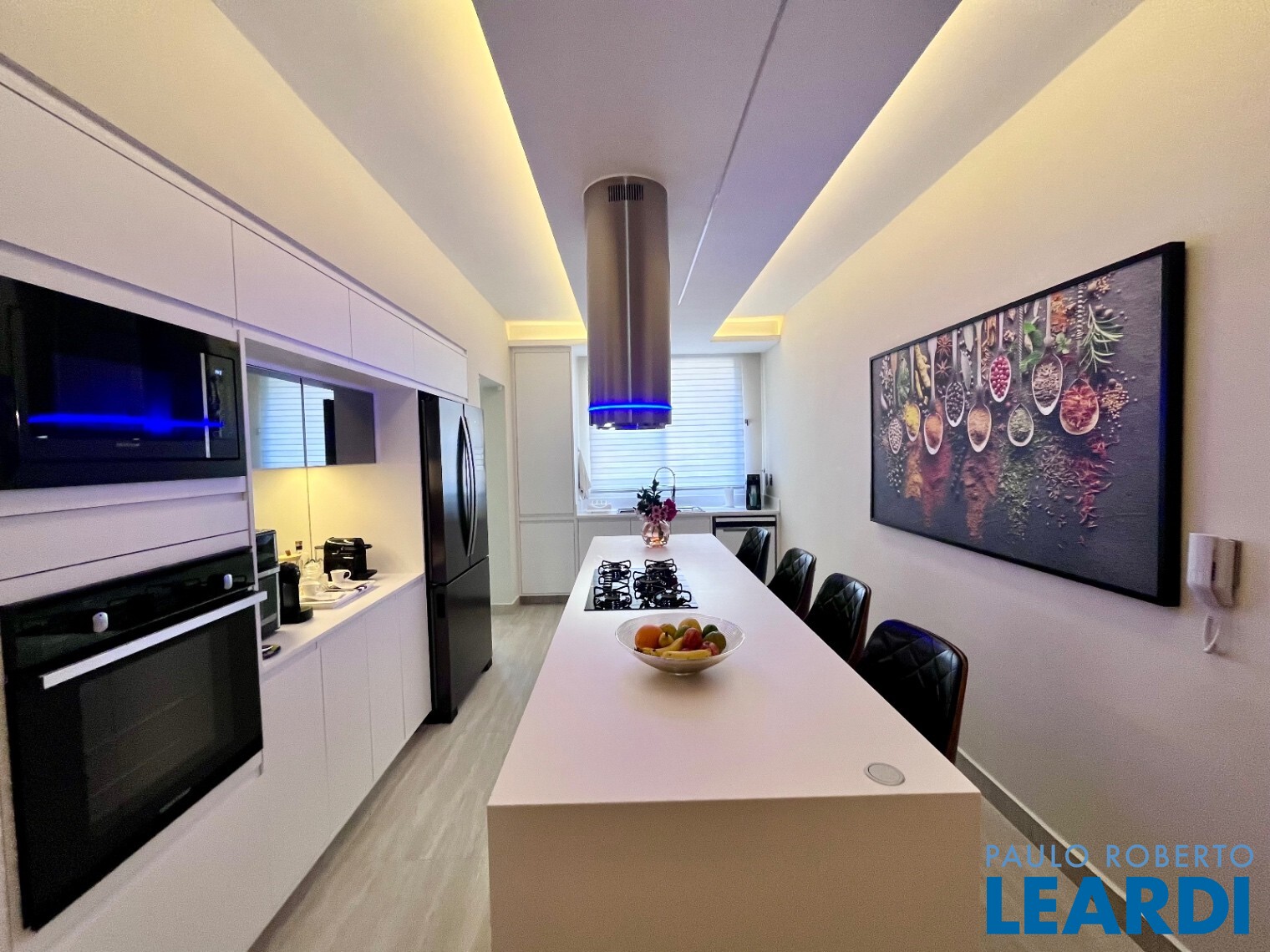 A cozinha é um verdadeiro destaque perfeita para quem gosta de cozinhar e receber equipada com tampos em Corian Dupont, ilha gourmet, forno, micro-ondas e convecção Brastemp, triturador e duas coifas.