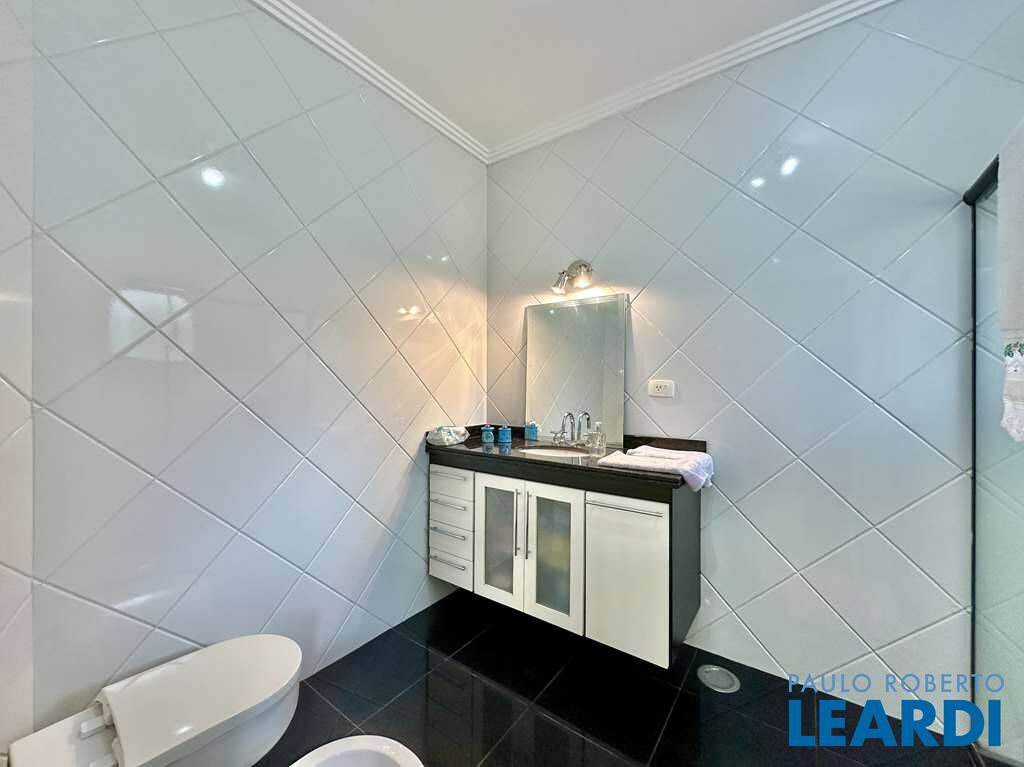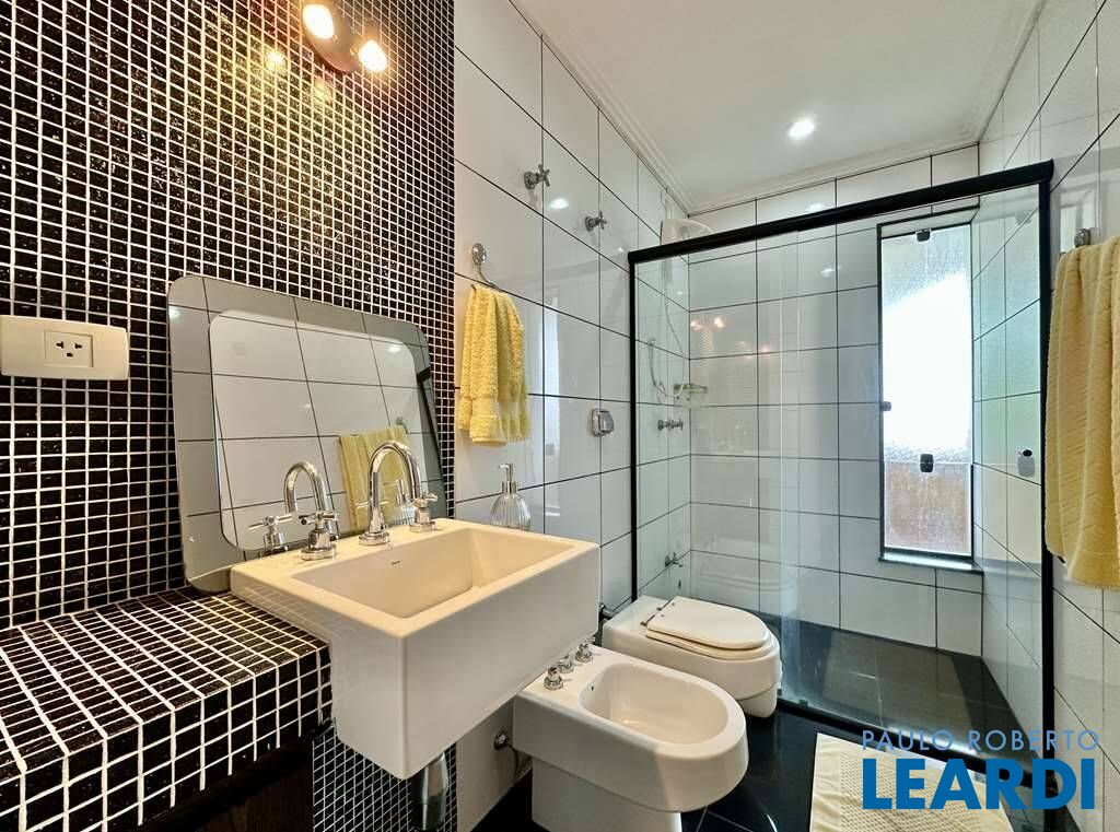 Banheiros com tampos em granito, espelho, gabinetes, detalhes em pastilhas e box de vidro.