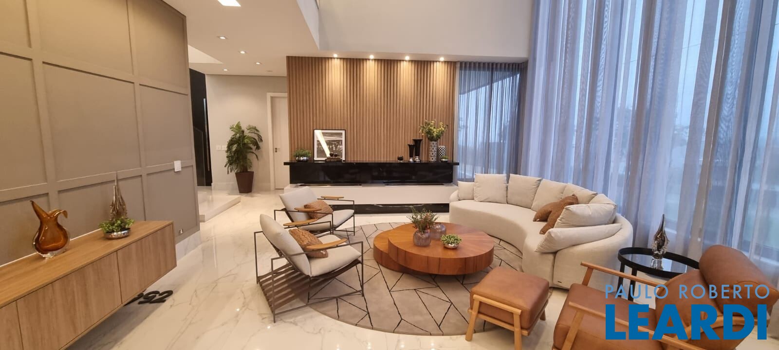 Com 490 m² de terreno e 472 m² de área construída, esta casa impressiona pelo living com pé-direito duplo, que traz amplitude e muita iluminação natural, além de lareira que torna o ambiente ainda mais aconchegante.