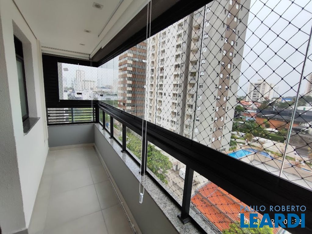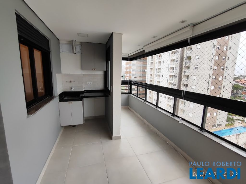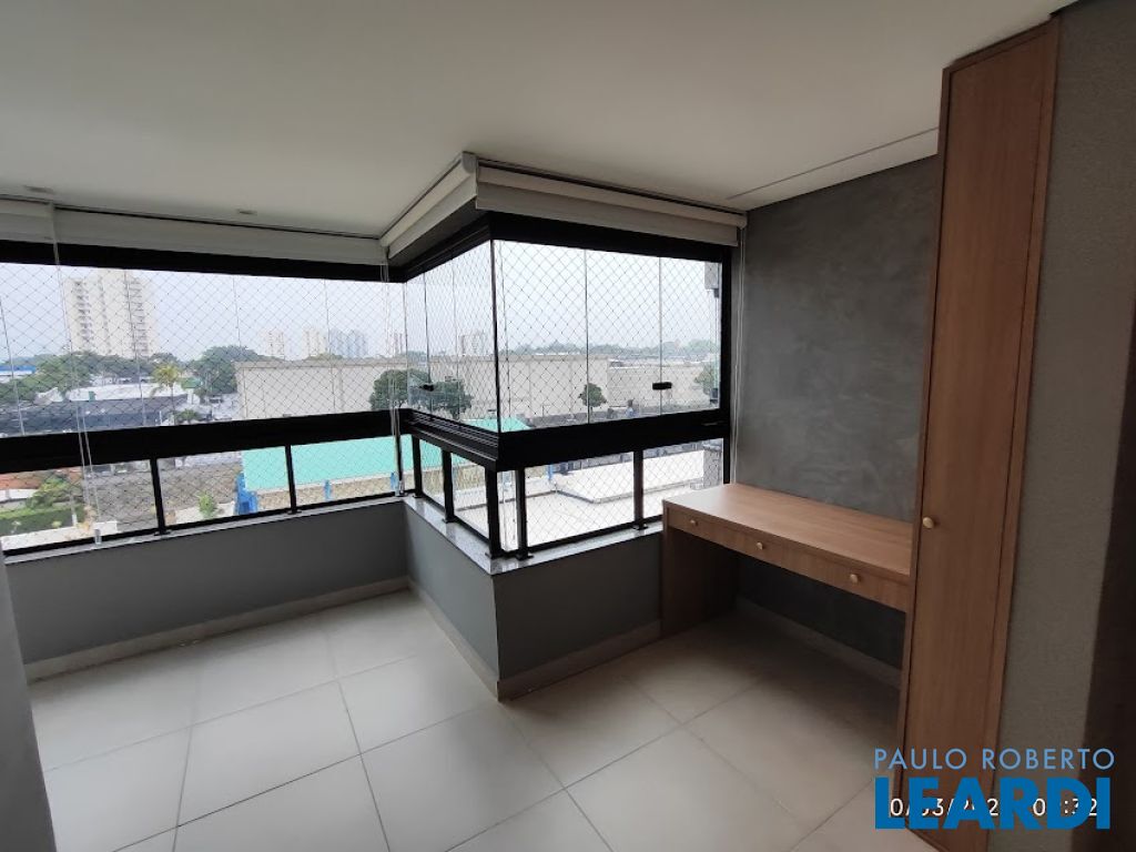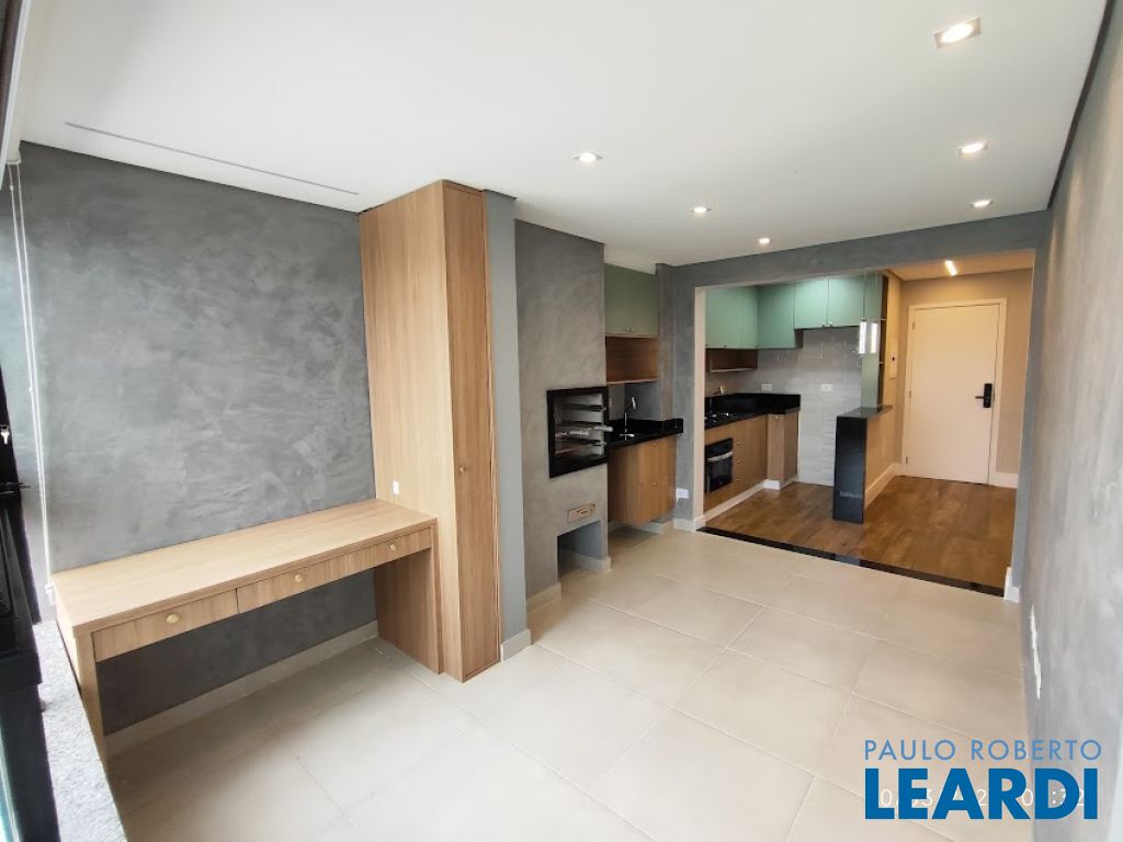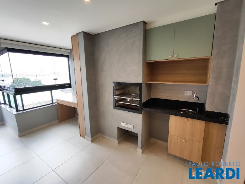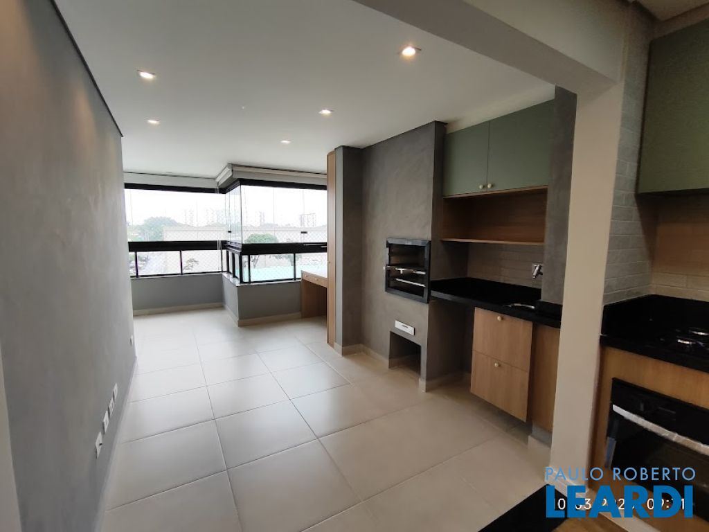 Varanda gourmet com churrasqueira, totalmente envidraçada e com cortinas.