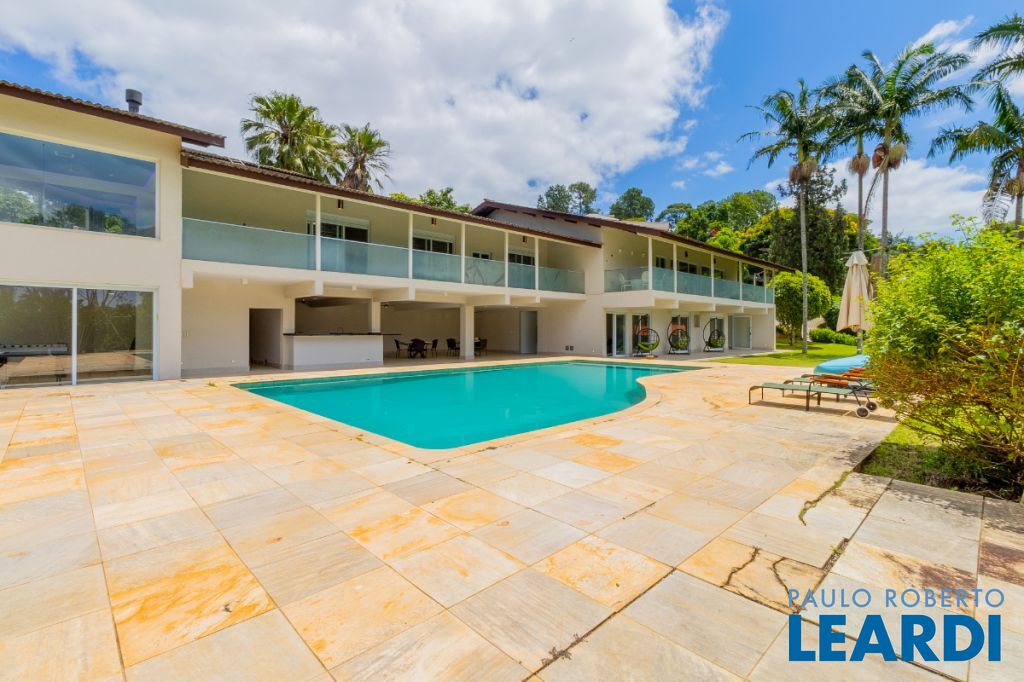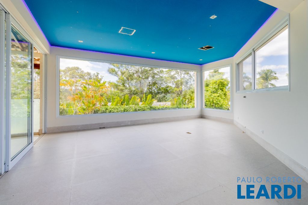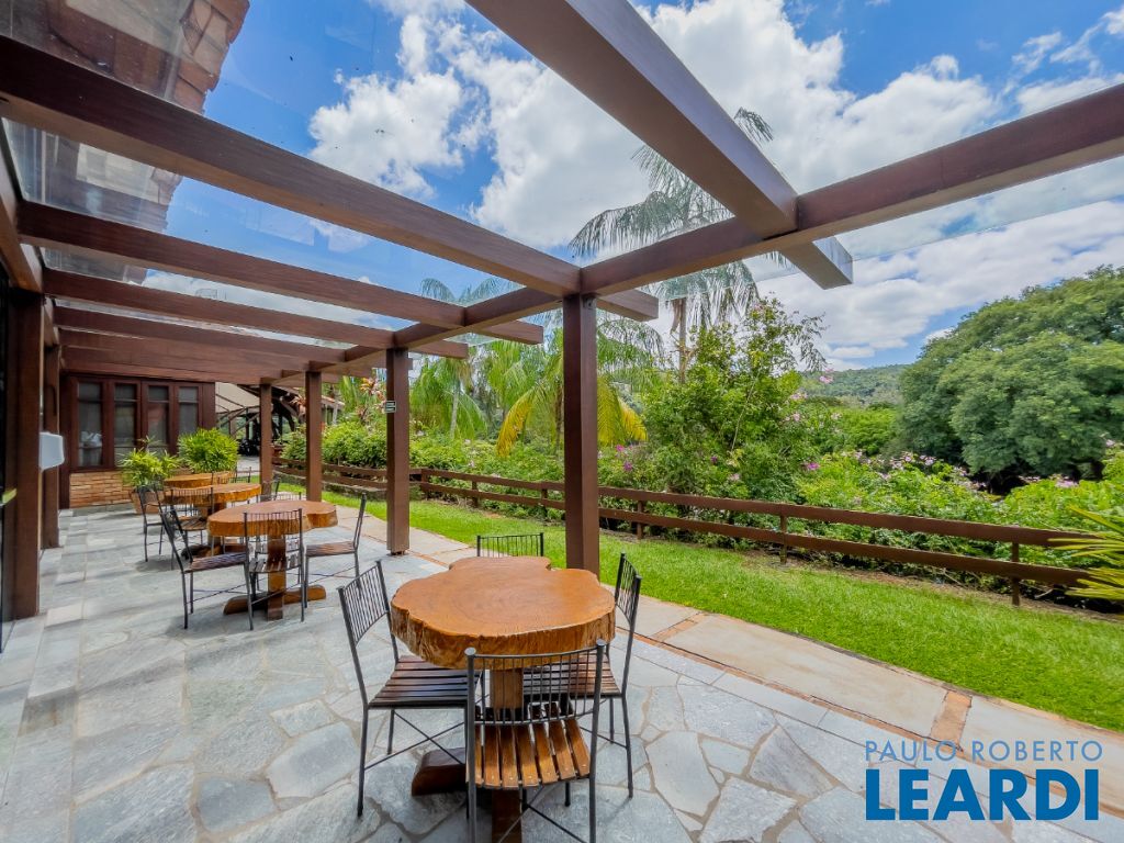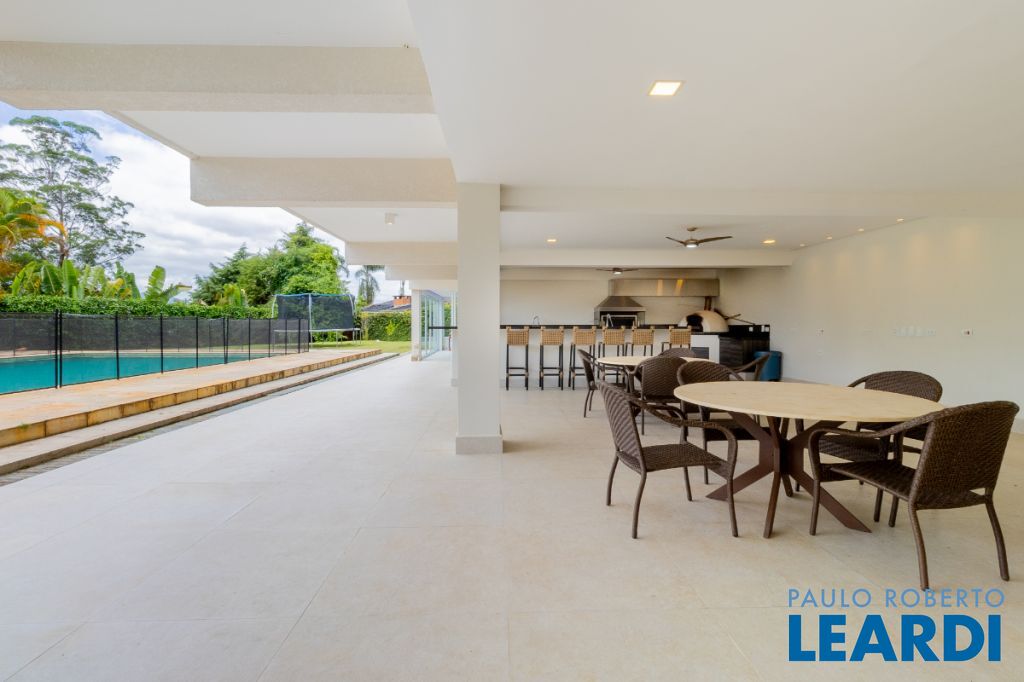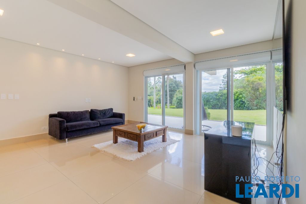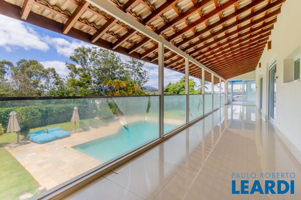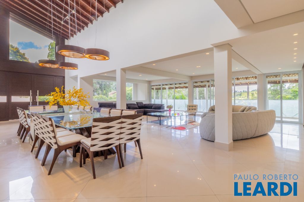Ainda neste andar encontra-se a elegante área social principal da residência, composta por uma sala de estar e sala de jantar extremamente amplas. A sala de estar possui pé-direito duplo, trazendo imponência e grande amplitude ao ambiente. As amplas janelas emolduram a paisagem natural ao redor da casa, criando a sensação de um verdadeiro quadro vivo da natureza. O ambiente conta também com varanda integrada.